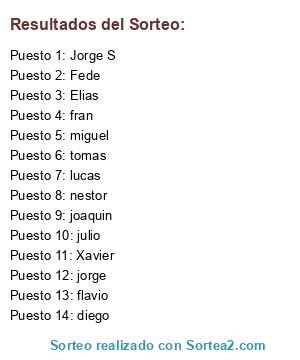 Lista de participantes: Fede, Elias, Jorge S, Xavier, Nestor, Diego, Tomas, Fran, Joaquin, Miguel, Julio, Flavio, Lucas, Jorge.