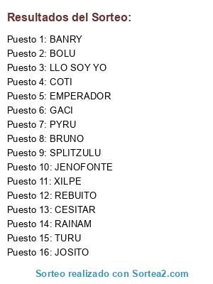 Lista de participantes: PYRU, RAINAM, LLO SOY YO, XILPE, SPLITZULU, TURU, EMPERADOR, CESITAR, BOLU, COTI, JOSITO, BRUNO, GACI, BANRY, REBUITO, JENOFONTE.