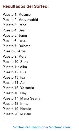 Lista de participantes: Bea , Inés , Inma, Laura, Isa, Jenni, Maria Sevilla, Míriam, Rocío , Sara, Ya sarria, Aroooa, Noe, Abi, Alba, Irene, Mery Madrid, Mery madrid , Maria twitter, Laura auryner, Carmen, Dolores, Noelia , Maria, Nay, Aroa, Natalia, Paula, Mery, Eva, Melanie.
