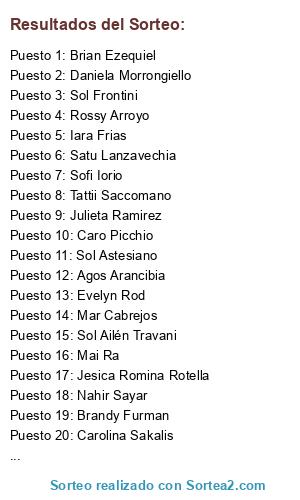 Lista de participantes: Dai Cejas, Daiana Natasha Samaniego Krakoviak, Juliana Chocovar, Sami Nacul, Maria J Nocito, Luz Borelli, Mily Islas, AAgus Moonte, Sofi Valdez, Vane Ocampo, Maria Elisa Carneiro, Dario Cabj, Agustina Monzón, Rocío Galli, Carla Viola, Martin Kf, Camila Gonzalez, Camila Montero, María Soledad, Elizabeth Chuliver, Giuli Delirante, Rocío B Cáceres, Ana Estrellita Vazquez, Vale Lera, Magali Serrano, Eugenia Rios Comba, Sol Frontini, Martín Chiesa, Roxana Torrico, Micaela González, Luciana Belén, Denise Embon, Magah Libonato, Antonella Oviedo, Camila Elli, Mai Ra, YamiLe Orieta, Agus Luna, Camila Fischetti, Lu Cejas, Floor Eckart, Mika Sayago, Eugenia Godoy, Brian Schaffer, Tattii Saccomano, Jessica Fraga, Vicky Martino, Meel Florance, Lucas Ezequiel Masip, Daniel Medina, Florchiss Falbo, Marlenee Montenegro, Iara Frias, Catalina Serrano, Guadalupe Algorta, Agustina Rivas, BeLén FLorencia, Andy Franco, Julieta Ramirez, May Bionica, Majo Machado, Julii Arboleera Bionica, Daniela Morrongiello, Dani Marquardt, Mala Influencia, Ornella Rusciano, Laila Amarillo, Leii Perez, Micaa Zelada, María Chöl, Celeste Himmlisch, Belu Gándara, Laly Cejas, Giuliana Cortés, Antonella Soledad Reynoso, Guada Lila Valdivia, Micaela Cabezas, Ludmila Dafne, Noelia Anahí, Florencia Matticoli, Rossy Arroyo, Andrea Carla Melgratti, Jazmin Barone, Eli Rodriguez, Mili Berti, Chechu Reinoso, Cheech Tello, Daiana Burg, Jorge Vazquez, Andrea Vojnov, Camila Oliva, Carolina Orué, Valentina Rebolledo, Micaela Lanfredi, Micaela Solange Segovia, Makarena Ottaviaano, Valle Alesso, Yesi Delloca, Sofi Iorio, Giselle Berges, Jess Astudillo, Cotii Corna, Guada Lupe, Luciana Minotti, Mar Cabrejos, Scecii Cardozo, Belen Bionica Zalazar, Georgina Dell' Abate, Nahir Sayar, Brandy Furman, Fede Pereyra, Florcis Buceta Iwaniszczuk, Sol Astesiano, Roh Carp, Estefania Roda, Sofia Juarez, Antonella Airplanes, Tomczyk Analia, Noelia Crescente, Tati Secchi, Sol Ailén Travani, Belen Aragon, Yasmín Casco, Flor Romano, Dieguito Alvarez, Sabrina Ailen, Carla Sotelo, Nicolás Irigoyen Lpda, Natalia Magri, Vicky Gonzalez, Amo A Seby FC, Euge Colantonio, Carolina Maria Giselle, Micaela Perez de Burgos, Agos Arancibia, Guada Ponce, Leeo Ríos, Melody Silveira, Jesica Romina Rotella, Martin Potenza, Caro Picchio, Maga Sanchez, Ana Clara Morana, Carola Ayala, Luu Lazarte, Jaqueline Provenzano, Flor Cordoba, LuLi Farias Güizzo, Leei Yeffal, Carolina Sakalis, Mili Florance, Sophie Bangertes, Lucia Eugenia Morana, Sabri Acuña, Leandro Irigoyen, Roo Campu, Luciana Mrl, Satu Lanzavechia, Natanael Ulrich, Milagros Ferrufino, Florencia Genchi, Brian Ezequiel, Evelyn Rod, Valeria Romano, Brendà Crespô, Flavia Rodriguez, Euge Amarfil, Sofía Salvatore.