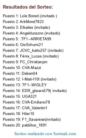 Lista de participantes: FC_Christianpin, TF1--WIGLEY, UGA321, pabliitoo_1891, GioSchumi21, Hiler10, CVA_Valentin1, ArkMond7823, CVA-Mazzi, Deben04, Lole Boneti (invitado ), Fénix_Lucas (invitado), Angeldurazno (invitado), Elkailex (invitado), EDR_gtwars579( invitado), F1_Savarese(invitado), I-Mati-I10I (invitado), JCVC_kaito257 (invitado), CVA-Emiliano78, .TF1--ARRIETA99.