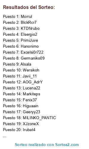 Lista de participantes: KTDNrubo, AOG_AdrY, MILINKO_PANTIC, Lucena22, Germaniko09, Pitu93, Vallemadrid123, XJzoneX, PrimiJuve, Geeryy23, Excelsi0r722, Chorrita, Hanonimo, Markiteps, Higuaain, Wersikoh, Irubat4, BlckRcr7, Elsergio2, Juniorcin, Morrul, Javii_11, Fenix37, Alsala, Wisiko, Kendo.