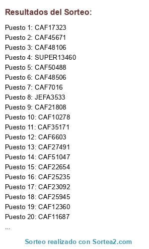 Lista de participantes: CAF10278 (22 participaciones), CAF11687 (19 participaciones), CAF12179 (11 participaciones), CAF12360 (15 participaciones), CAF17323 (15 participaciones), CAF20851 (6 participaciones), CAF21808 (22 participaciones), CAF22654 (7 participaciones), CAF23092 (20 participaciones), CAF25235 (9 participaciones), CAF25945 (12 participaciones), CAF27491 (18 participaciones), CAF35171 (13 participaciones), CAF45671 (25 participaciones), CAF48106 (17 participaciones), CAF48506 (11 participaciones), CAF50488 (22 participaciones), CAF51047 (16 participaciones), CAF5683 (4 participaciones), CAF6603 (9 participaciones), CAF7016 (8 participaciones), JEFA3533 (11 participaciones), SUPER13460 (10 participaciones), SUPER13460.