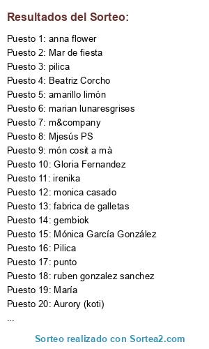 Lista de participantes: NOELIA CHAVES, Mar de fiesta, Cecilia Cobos Hernández, Beatriz Corcho, Aurory (koti), Mónica García González, irenika, Mónica Prieto García, Déborah Tg, Parafarmacia La Vega, marian lunaresgrises, punto, Doll Houses, jaritas cookies, Cris [Horno de Colores], Victoria, món cosit a mà, Cucharadas de placer, Vivi Taboada, Cristina Sweetlandmi mamina y sus cosas (Rosa), meli cocinillas de sevilla, Mjesús PS, Jesica Maccio, Gloria Fernandez, Marina, María, Ana Fernández-Gayoso Mediero, erkuden, CaSSia, gembiok, ruben gonzalez sanchez, m&company, Paula Aguado Fernández, Ana Victoria, raquel duran perez, msolis, m_monika10, Fatima, Pilica, Los detalles de Patricia, amantes urbanos, elenatin, antonia hurtado, silvia gomez sendino, cirstina ontoso, monica casado, eva lo , fabrica de galletas, como la vida misma , cassia, paula aguado, anna flower, casita del lago, pilica, little secrets, anis roman, paoluchi, amarillo limón, Paula moreno.