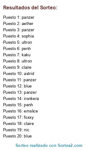 Lista de participantes: panzer (4), claire (2), blue (2), penh (2), ultron (2), nic, foxxy, ironkera, kaku, sophia, emslice, astrid, aether.