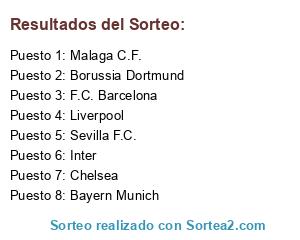Lista de participantes: F.C. Barcelona, Sevilla F.C., Malaga C.F., Bayern Munich, Chelsea, Liverpool, Inter, Borussia Dortmund.