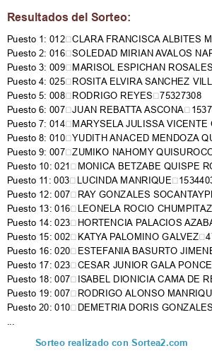 Lista de participantes: 002 CECILIA SALINAS RAMOS 08075696, 002 ELVA LUZ MATOS SAPALLANAY 15428682, 002 KATYA PALOMINO GALVEZ 47755901, 002 LIDIA MACHADO RAMOS 10760530, 002 MARIA BEATRIZ RAMOS TALLA 45827784, 002 MARIA FLORENCIA TAYA TATAJE 15403470, 002 MARIBEL ROCIO QUISPE TALLA 42524293, 002 ROSA BERTHA RAMOS TORRES 15369878, 002 SONIA BRIGIDA ARIAS CARDENAS 15395435, 003 ALICIA CORTEZ 46197305, 003 ANDREA NICOL MASIAS ARIAS 62608751, 003 ANGEL FERNANDEZ CHAVEZ 45113517, 003 ANTHONY ERNESTO PALOMINO COTIPA 47005360, 003 BRIGGITH PAOLA SANATA CONDORI 73763284, 003 CARLOS SODARIO HUAMAN SICHA 21818355, 003 DENIA LEON 45806015, 003 DENIS YERSON EVANGELISTA HUAMAN 70541189, 003 EDGAR ANTEZANA ROQUE 43411354, 003 EVELYN NOEMI QUISPE CUENCA 76284775, 003 FLORINDA SANCHEZ DE LUYO 15375457, 003 GINA PAULA FERNANDEZ SALVADOR 15451492, 003 JANETH MILAGROS VILLALOBOS CUZCANO 44543847, 003 JUAN JOSE JASSO HUAMAN 08362393, 003 KEYLA SOLEDAD NICOLE MANZO AYAUCAN 74430451, 003 LIDIA INES URQUIZO FLORES 15379641, 003 LINO RANGEL VALDERA PENA 75130615, 003 LIZ AURORA ROQUE SANDOVAL 40357170, 003 LOURDES MARIBEL HUAMAN CULLANCO 46404679, 003 LOURDES PONCE DE PALACIOS 15344350, 003 LOURDES ZINTIA LUJAN SAMANEZ 48123332, 003 LUCINDA MANRIQUE 15344030, 003 MAGDALI ELIZABETH FLORIAN PEREZ 15429424, 003 MARCO ANTONIO SANCHEZ FUENTES 44180282, 003 MARIA DEL CARMEN CORONEL PASACHE 47301275, 003 MARIA ELENA SANTOS QUISPE 15352221, 003 MARIA MAGADALENA PORTUGUEZ ZAVALA 15400148, 003 NAGHELY BRESSIA TAXA JAULLA 74995373, 003 ROSA GIOVANA CUZCANO ALBINO 15432303, 003 ROSA JULIAN 75343071, 003 ROSA LUZ GUZMAN DE BAZAN 15347286, 003 ROSA SONIA VALLIMBROCIO MAGALLANES 15409065, 003 ROSARIO DEL PILAR BERNEDO ILLESCA 15437357, 003 ROSEMARIE ERLINDA CARDENAS GUTIERREZ 15433077, 003 RUTH HUAMAN 47622278, 003 RUTH IRENE HUAYANA CHINCHAY 76413836, 004 ELIDA LUCIA GAGO SANDOVAL 71666986, 004 FRANSHESKA GERALDINE HIPOLITO VICENTE 74207843, 004 MONICA TRUJILLO ORELLANA 46532372, 005 DULCE MARIA ESPINO A FERNANDEZ 72079705, 005 KARLA ZAVALA 70441841, 005 MARIA DEL PILAR TOMAS CHUMPITAZ 40585268, 005 MARIA ELENA CASTANEDA QUISPE 15435528, 005 MARIA ROSSANA RAMOS MANCO 15425607, 005 MARISA JULIA URBINA HUAPAYA 15424391, 005 MARLENE RIVAS MEDRAZA 43707144, 005 RUTH MARILYN ARIAS FRANCIA 43015648, 005 TOMASA CUSIHUAMAN CERON 15391788, 006 GERARDO ALBERTO FLORIA VELASQUEZ 70769120, 006 SNEYLA YAJAIRA AG UIRRE QUISPE 75661244, 007 DORIS DAMAS ALIAGA 20018366, 007 FELICITAS PAREJA ALCAZAR 15452711, 007 FRANCISCO JOSEMAR PEVEZ CORTEZ 70787449, 007 ISABEL DIONICIA CAMA DE REVATA 15441710, 007 JENY DIOSELIN GONCES DIAZ 43984810, 007 JUAN REBATTA ASCONA 15379574, 007 LILIANA LUZ CENTENO CARRION 76599168, 007 MARIBEL BLANCA TORRES MANZA 47061154, 007 MARIELA JENNY GARCIA NAPAN 15431179, 007 MARITZA CONCEPCIONA GUTIERREZ ABURTO 15422854, 007 MARLENY ROSINA CANDELA COSSIO 76405550, 007 MILAGROS JESUS ESCALANTE ANGULO 40787952, 007 NAYSHA CAROL ZAVALA DE LA CRUZ 77076698, 007 RAY GONZALES SOCANTAYPE 76248051, 007 RODRIGO ALONSO MANRIQUE VIVANCO 72838335, 007 SONIA QUINTANILLA HUASACA 15431971, 007 YOSELYN GUTIERREZ ORIUNDO 75454625, 007 ZUMIKO NAHOMY QUISUROCO CANDELA 76275837, 008 AMPARO VILCA MOSCOSO 10354969, 008 BETTY MARIA SANCHEZ PORTUGUEZ 08551527, 008 CAROLINA GERMAN HUAPAYA 41115042, 008 EDALIA HUAYA ROJAS 44239710, 008 EVENS YHONATAN VILLEGAS DE LA CRUZ 45786485, 008 GULLIANA MARIA JOSE BORJAS ZEVALLOS 48557532, 008 HILDA ROCIO QUISPE RUIZ 15433971, 008 IRMA ISABEL CAMACHO MENDOZA 07893026, 008 JOSEFA GODOS RAMIREZ 03380783, 008 LORENA MARLENE JOYA VARGAS 15408414, 008 MARTIN CHAVEZ PASACHE 03360158, 008 MATILDE DEL ROSARIO ALMEYDA SOLIS 47029757, 008 NELIDA SILVA LOPEZ 40765657, 008 RODRIGO REYES 75327308, 008 ROSA MARITZA ROUSSELL QUISPE 45025579, 008 ROSALIA PAULA BASURTO BALTAZAR 43264706, 008 RUTH NOEMI BARAZORDA CHOQUE 42877297, 008 ZORA ROSSANA ARIAS CHAUCA 43000552, 009 DEYSI PILAR CAMACHO MEJIAS 42730195, 009 ELIANA TERESA ARIAS VICENTE 44747379, 009 ELIZABETH ALARCON CANTO 47635765, 009 ELIZABTEH NICHCA FLORES 47573708, 009 JUAN CARLOS CHAVEZ ZAPATA 70442377, 009 LINA MARGARITA BALCAZAR DE MOREYRA 21870485, 009 MARISOL ESPICHAN ROSALES 15439344, 009 ROSALES ESTHER DE LA CRUZ LEVANO 15404838, 009 RUTH KELINA IGNACIO SEAS DE ESPINOZA 45203084, 009 SHIRLEY OFELIA HUAMAN MATIAS 41350068, 009 SONELY THALIA QUINTO NAVARRO 47845572, 010 BRIGIDA RICARDINA DE LA CRUZ SANCHEZ 75203882, 010 DANIEL JAMIE ENRIQUE VICENTE TARAZONA 72799646, 010 DEMETRIA DORIS GONZALES CUTODIO 15374726, 010 DESSIREE DEL PILAR GALINDO MENDOZA 48851328, 010 ELIZABETH LETICIA CUBA PARIONA 75832984, 010 ERIKA LIZETH HERRERAS POLO 75859868, 010 FELICITA YASTAYO VICENTE 15405280, 010 GRECIA SALOME PEREZ TABOADA 70277515, 010 KARIM ASCONA 76423636, 010 KAROL SOLEDAD SANCHEZ ROMAN 71085900, 010 LIZ MILAGROS GONZALO VERTIZ 73144563, 010 MARIA ANA MONTENEGRO BAUTISTA 16715465, 010 MARIBEL APUMAYTA MENESES 48376422, 010 NELIDA ESTHER JIMENEZ CHAVEZ 15374012, 010 PAMELA DARCY GAGO SANCHEZ 76232724, 010 PEDRO ANDERSON CAYCHO MONTENEGRO 70357660, 010 SUSANA NEYRA BAYGORIA 45996625, 010 WENDHY CONSUELO CASIQUE CHUPAYO 71530501, 010 YUDITH ANACED MENDOZA QUISPE 73783170, 011 PAMELA MAGALY LLASHAG ZANABRIA 77281512, 012 ANA MARIA QUISPE DE PADILLA 15347911, 012 ANGELICA MORAYMA ASIN QUISPE 42130212, 012 BLANCA LUZ CARTAGENA CHICO 15378056, 012 CLARA FRANCISCA ALBITES MACHA 73829736, 012 FAVY ALBERTO VALDIVIA AROSTE 41777740, 012 JHOSET RIDICK CHAVEZ CONGO 47767655, 012 JOHANI KATHERINE TEJEDA CARTAGENA 43527619, 012 JOSE FELIPE SANCHEZ SANCHEZ 15433460, 012 KARINA JESSICA LAURA ROJAS 42255849, 012 MARIA DE LA CRUZ MURAYARI 60194914, 012 NELSON PACAYA ACHO 60792243, 012 NESTOR GUILLEN RAMIREZ 40254997, 012 ROSAURA CASQUI O DE AVENDA O 15412642, 012 SOLEDAD PEREZ BERROCAL 75705965, 012 WALQUER MURAYARI 75807035, 012 YENNY MARTEL GONZALEZ 42824589, 014 CARLOS MIGUEL GUERRA RAMOS 40449308, 014 ETHEL TARCILA CANALES CAMPOSANO 15358159, 014 FEDERICO MACHA ADRIANO 43580097, 