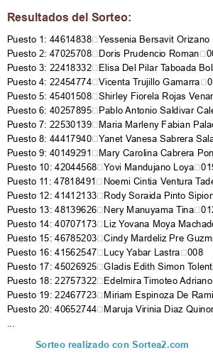 Lista de participantes: 22411378 Adela Munguia Flores 001, 43513997 Adelayda Pardave Lazaro 001, 76509112 Aivy Fiorella Calderon Bravo 001, 22518457 Alejandra Maritza Falconi Ancajina 001, 22420224 Alejandra Teresa Toledo Minaya 001, 22422294 Ana Del Rosario Trujillo Chavez 001, 21258665 Ana Eulalia Hidalgo Arias 001, 41638774 Ana Monica Pardave Vergara 001, 76355804 Andrea Lucero Aguirre Cortez 001, 73600675 Angela Lucero Martel Arratea 001, 41741978 Angela Miriam Salazar Condezo 001, 46853063 Angelica Cabrera Albornoz 001, 22477254 Angelica Maria Tolentino Leon 001, 70800914 Anmd Jagger Kesvy Hurtado Pimentel 001, 42336009 Antonia Fanan Damian 001, 47284943 Anyela Espiritu Huaman 001, 22414040 Aurelia Calderon De Ramirez 001, 45408268 Aurelia Pilar Trujillo Correa 001, 72714681 Ayda Felipa Trujillo Carbajal 001, 22971909 Azucena Cantaro Lopez 001, 47394604 Azucena Margarita Estraver Valverde 001, 45122089 Beatriz Janeth Vela Valdivia 001, 43222716 Beatriz Melany Guillermo Castillo 001, 06279096 Bertha Gladys Nieves Vela 001, 22414062 Bertha Ordonez Leon 001, 22517039 Bertha Rafaelo Aguirre 001, 71199595 Betsy Olenka Acero Dominguez 001, 75366218 Brayan Antony Ureta Alcedo 001, 44201995 Candelaria Del Pilar Alomia Vitor 001, 40948762 Carla Yanina Lucano Rojas 001, 22518924 Carmen Rosa Miranda Gonzalez 002, 73384799 Cassandra Marielena Inostroza Ramirez 002, 22429097 Celia Irma Vicente Yumpe 002, 46785203 Cindy Mardeliz Pre Guzman 002, 41776363 Cinthia Carmela Salcedo Davila 002, 44962691 Cintia Katerin Carhuaz Millan 002, 22465397 Clorinda Lusbelia Bravo Figueroa 002, 22403350 Concepcion Valentina Cabanillas Malpartida 002, 22426519 Dadeyva Medina Castaneda 002, 22883235 Dalila Ines Salinas Palomino 002, 80065439 Dalinda Trinidad Salazar 002, 47036741 Damaris Betzabe Trujillo Inocencio 002, 71888054 Danha Jenifer Alva Palacios 002, 71695179 Danika Layla Magro Huanca 002, 48320516 Dany Ramirez Simon 002, 45449742 Deisy Edith Bustamante Madrid 002, 41135539 Delcy Nydia Pozo Meza 002, 22511188 Delia Cristina Munguia Agui 002, 72383312 Devora Sarai Flores Castaneda 002, 44561702 Deysi Ruiz Hoyos 002, 44782984 Diana Blas Seferino 002, 22507309 Diana Esther Soto Coz 003, 40351151 Diana Lourdes Trujillo Argandona 003, 46384680 Dina Lizbet Gomez Carpio 003, 73741630 Doris Magdelia Ponce Juanan 003, 45723588 Doris Marquez Soto 003, 47025708 Doris Prudencio Roman 003, 46892649 Dyancaro Palpan Valer 004, 22757322 Edelmira Timoteo Adriano 004, 72375951 Edith Yasdaly Bartolome Tarazona 004, 40680837 Elcira Lozano Castro 004, 22431972 Elena Elvira Centeno Quintana 004, 71947748 Eli Eleonor Sampayo Arimuya 004, 22418332 Elisa Del Pilar Taboada Bolarte 004, 41152219 Elizabeth Antonia Marchan Valverde 004, 22486634 Elizabeth Nolasco Bravo 004, 42741257 Elizabeth Roxana Huaqui Alvarado 004, 47433974 Elizabeth Sandy Flores Diaz 004, 41366834 Elva Lizhet Carbajal Zevallos 004, 74498310 Emenis Betsi Capcha Cienfuegos 005, 43146043 Erlinda Esther Herrera Aquino 005, 04017638 Espejo Robles Belarmina 005, 74657368 Estalita Alida Benancio Gregorio 005, 22486572 Ester Reveca Alva Alvarado 005, 72720215 Esthefany Jhenifer Ramos Pinan 005, 43103698 Esther Aranda Mendoza 005, 00996361 Esther Saavedra Jaramillo 005, 44962711 Eulalia Amelia Fabian Recinas 005, 40650715 Filomena Sadith Santillan Gonzales 005, 71929427 Fiorella Sudario Pablo 005, 42980119 Flor Cecilia Ferrer Escobar 005, 42311175 Flor Ines Ortiz Jimenez 005, 22486986 Flor Pucarina Almerco Montecino 005, 72377849 Flor Yasminda Masgo Laurencio 005, 22461307 Florinda Gonzales Venturo 005, 22509959 Fortunato Echeverria Santillan 005, 70861507 Franliz Lilian Vargas Durand 005, 42482261 Frida Condezo Avila 005, 75540193 Gerlly Naomi Dolores Tineo 006, 22512280 Gilda July Espejo Robles 006, 76038717 Giovana Torres Pascual 006, 45831157 Gisela Salazar Cantaro 006, 45026925 Gladis Edith Simon Tolentino 006, 22474224 Gladis Otilia Solorzano Armas 006, 42369665 Glibeth Bajonero Rodriguez 006, 22430318 Gloria Lucia Rojas Martinez 006, 76119732 Greyci Almendra Rufino Echevarria 006, 44770127 Guicela Llanos De Lao 006, 22508779 Guillermo Lavy Fretel Magarino 006, 22486355 Helen Nalda Acevedo Laguna 006, 22666624 Herlinda Carmen Nolasco Camacho 006, 22432731 Hilda Judith Ramos Paucar 006, 22400591 Hortencia Zevallos Garcia 006, 47657788 Ines Flores Picon 006, 71660046 Ingrid Selene Acuna Crespo 006, 77023892 Iris Marleny Falcon Vara 006, 22739408 Irma Cordero Fabian Cardenas 006, 80083014 Isabel Meza Calderon 006, 22400169 Isabel Millan Mori 006, 73346220 Isabel Modesto Santillan 006, 22407371 Ivonne Maritza Ramirez Claud 006, 47562700 Jackelyn Grecia Hidalgo Soto 006, 40422574 Jacqueline Marleni Tarazona Rojas 006, 40237194 Janeth Robertina Onofre Eduardo 006, 47570152 Janeth Rocio Espinoza Cerrano 006, 75724064 Jannelly Erlinda Ugarte Arostegui 006, 47031730 Jeide Luz Martel Rojas 006, 40973532 Jessica Del Pilar Cubas Delgado 006, 44002713 Jessica Rocio Atencio Gonzales 006, 46039305 Jhonattan Jose Marquez Ruiz 006, 71819219 Jhoselin Karen Guillermo Ramos 006, 40422556 Joanna Melissa Orbezo Bravo 007, 42366387 Josefina Filomeno Carhuapoma 007, 22510094 Joyce Ingrid Flores Vidal 007, 22521851 Juan Eduardo Mosquera Espinoza 007, 80122882 Judith Cueva Salgado 007, 22497648 Julia Huanca Blas 007, 76323655 Juliana Cajalin Trujillo 007, 45339932 Julisa Figueroa Correa 007, 43008763 Julissa Isabel Ramos Romero 007, 43226145 July Elvia Hermosilla Maccha 007, 72625182 Karen Margoth Rosas Vara 007, 46052927 Karina Yudith Santos Apac 007, 70679969 Karla Nalvarte Salazar 007, 47494257 Katherin Yelitza Romero Malpartida 008, 48762224 Keren Mishell Tello Uriarte 008, 72424778 Kriss Alessandra Matos Aseijas 008, 23013852 Lelis Flores Amasifuen 008, 72305951 Leslie Samantha Bravo Salazar 008, 72641265 Leydi Estefanny Rojas Gonzales 008, 47534661 Leydi Karol Flores Albornoz 008, 47300830 Leydi Katia Leiva Caldas 008, 09052577 Lida Layla Caqui Miranda 008, 47846065 Lila Lucila Geron