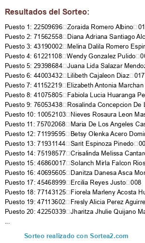 Lista de participantes: 40344560 Abad Rojas Palacios 007, 22422263 Alberta G Manzano Tarazona 018, 22420224 Alejandra Teresa Toledo Minaya 006, 41601609 Alfredo Valois Dominguez Rosales 009, 22473962 Alicia Avila Jesus 019, 41367646 Alicia Bela Ayllon Ramos 011, 22504560 Alicia Elizabeth Acosta Oliver 014, 44736618 Ana Cecilia Trinidad Nazairo 008, 22507004 Ana Ivonne Aparcana Laos 017, 41638774 Ana Monica Pardave Vergara 018, 73654228 Ana Yudit Sebastian Valladares 019, 71057330 Andrea Alexandra Perez Rojas 010, 42728255 Andrea Maribel Zamudio Orbezo 016, 43566852 Angela Mily Salazar Figueroa 008, 41741978 Angela Miriam Salazar Condezo 017, 46853063 Angelica Cabrera Albornoz 006, 75774906 Angelica Diaz Espinoza 018, 22477254 Angelica Maria Tolentino Leon 018, 76382250 Anghela Sarai Gamarra Meza 018, 73216932 Anghi Alejo Garcia 016, 48730684 Angi Dayana Zevallos Presentacion 014, 44270374 Ann Marleny Sanchez Mallqui 014, 40260329 Antonia Alicia Pablo Marino 006, 75935531 Ashli Jhandy Trujillo Ojeda 012, 22879760 Asunciona Arango Ortega 016, 22484746 Aurelia Falcon Pinan 008, 45408268 Aurelia Pilar Trujillo Correa 016, 42150579 Avi Griselda Aponte Vega 011, 72714681 Ayda Felipa Trujillo Carbajal 002, 44215036 Aydee Teodor Vargas 008, 04014916 Bauta Aquilh Carhuaz Valentin 013, 46848745 Beatriz Huerto Salas 014, 45122089 Beatriz Janeth Vela Valdivia 010, 22674386 Belia Maria Meza De Pozo 019, 22960314 Berdith Avila Ramirez 008, 22406176 Bertha Eumelia Vidal Vargas 016, 06279096 Bertha Gladys Nieves Vela 012, 71199595 Betsy Olenka Acero Dominguez 012, 20891857 Bety Nilda Arias Arzapalo 012, 75366218 Brayan Antony Ureta Alcedo 016, 45632567 Brescia Concha Collazos 008, 40398204 Brijida Gamara Abad 016, 42532384 Caetana Isla Figueroa 008, 72861095 Carla Diana Palacios Capcha 012, 22518924 Carmen Rosa Miranda Gonzalez 019, 77227071 Carolina Tarazona Minaya 013, 73384799 Cassandra Marielena Inostroza Ramirez 011, 22411654 Catalina Atanacio Bejarano 014, 77921444 Celedonia Cabello Tineo 009, 22429097 Celia Irma Vicente Yumpe 005, 45576253 Celia Rumi Leiva 018, 42503202 Cinthya Dolly Zelaya Baldeon 014, 22656348 Cirila Fretel Castro 014, 44273634 Claudia Mery Cardona Saldana 011, 22500001 Cledida Rosa Quiroz Tucto 017, 80006920 Clenda Orfila Cierto Berrospi 005, 22465397 Clorinda Lusbelia Bravo Figueroa 018, 22403350 Concepcion Valentina Cabanillas Malpartida 018, 47240211 Crecia Thalia Trujillo Melchor 007, 75198577 Crisalinda Melissa Cantaro Trinidad 016, 45575747 Cynthia Silvia Huaman Espinoza 012, 41411694 Dalmiro Daniel Roque Palpa 014, 46773433 Dania Yajaira Isidro Antaurco 007, 40695605 Danitza Danesa Asca Morales 014, 48503533 Debora Keren Ojeda Morales 002, 60003420 Deily Yoselina Hilario Toribio 003, 76201745 Deissy Milagros Arrieta Rodriguez 011, 22419488 Delia Alejo Tumbay 001, 22511188 Delia Cristina Munguia Agui 006, 22461359 Delia Guerra De Callupe 008, 46417520 Delia Verde Fabian 017, 41798672 Dency Ortiz Ponciano 006, 44503594 Denis Shara Rasales Morales 013, 46825048 Deny Aquino Espiritu 010, 44561702 Deysi Ruiz Hoyos 017, 71562558 Diana Adriana Santiago Alcantara 007, 44782984 Diana Blas Seferino 010, 22507309 Diana Esther Soto Coz 013, 43907868 Diana Jazmin De Vanessa Escobal Chaupis 007, 41372043 Diana Jenny Sabino Garcia 013, 74366955 Diana Liz Huaranga Carrera 012, 22505330 Dina Ursula Fuentes Gomez 017, 22479662 Diosa Linda Asencio Gonzales 017, 71941403 Dora Esther Rojas Padilla 003, 22440689 Dora Luz Rivera Trujillo 014, 46892649 Dyancaro Palpan Valer 002, 40885150 Edhit Marleny Garcia Jaimes 016, 40885150 Edhit Marleny Garcia Jaimes 016, 43837060 Edith Lili Jimenez Pena 011, 43007502 Edith Marcelina Villareal Moreno 017, 72375951 Edith Yasdaly Bartolome Tarazona 008, 22483954 Eladia Revolledo De Acosta 019, 22507155 Elcira Lourdes Ferrari Tineo 006, 22431972 Elena Elvira Centeno Quintana 008, 43978786 Elena Gutierrez Calderon 008, 74421138 Elian Joselin Davila Carhuapoma 003, 41152219 Elizabeth Antonia Marchan Valverde 008, 22470447 Elizabeth Cabrera Castaneda 001, 40631886 Elizabeth Calderon Eduardo 006, 22485364 Elizabeth Cristobal De La Cruz 006, 42741257 Elizabeth Roxana Huaqui Alvarado 012, 22517709 Elizabeth Salazar Crespo 006, 43056952 Elsa Milagros Fabian Calero 018, 76738794 Elva Edith Salas Huanca 003, 22462327 Enedina Vilma Visag Berrospi 008, 22419450 Epifania Andrade Ramos 010, 45468999 Ercilia Reyes Justo 008, 40885852 Erika Calderon Fernandez 018, 42663971 Erika Doris Damian Zevallos 008, 22460393 Ernestina Gerra Morales 016, 06623197 Escolastica Chavez Cardenas 008, 74686189 Esmeralda Gomez Medina 018, 74993286 Esperanza Fabiola Pimentel Crispin 011, 76848502 Estefani Raquel Contreras Andrade 004, 22642808 Esther Morales De Pajuelo 002, 00996361 Esther Saavedra Jaramillo 017, 72295141 Estrella Lucero Nunez Velez De Villa 013, 04205266 Eunice Porras De La Rosa De Toma 006, 72031297 Evelin Melania Espinoza Perez 002, 73580109 Evelin Stephania Guillermo Cueva 018, 71782272 Evelyn Abigail Calderon Pascual 016, 72717609 Evelyn Milagros Ramos Grados 017, 41075805 Fabiola Lucia Huaranga Perez 018, 22658279 Felisa Meza Huerto 002, 72125779 Fideli Mireya Cajas Orizano 016, 77143125 Fiorela Marleny Acosta Huapaya 014, 72377880 Fiorela Sarabia Sanchez 009, 45975454 Floida Clusyola Sobrado Pineda 003, 46524815 Flor Damiano Quintana 017, 71322747 Flor Maria Aguirre Dominguez 004, 46704895 Flor Marissa Chavez Falcon 017, 25846954 Flor Selene Sanchez Solis 006, 73620557 Floricel Neyva Serrano Cajas 002, 22461307 Florinda Gonzales Venturo 012, 22509959 Fortunato Echeverria Santillan 008, 80124118 Francisca Aguirre Morales 008, 47113602 Fresly Alicia Perez Aguirre 014, 22507536 Gelem Soledad Zavaleta Padilla 017, 22489566 Gina Del Pilar Mauricio Encarnacion 007, 42067045 Gioliana Tapullima Isuiza 016, 22674236 Gisella Rosa Francisca Centeno 002, 22419655 Gladis Escobal Huerto 008, 22640368 Gladis Serrano Jara 002, 46396640 Gladys Trujillo Ponce 002, 44164901 Gloria Celia