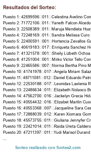 Lista de participantes: 21258665 001 Ana Eulalia Hidalgo Arias, 45991504 001 Carla Esteban Ponce, 70781393 001 Carla Silvana Falcon Marani, 45464038 001 Cecilia Pimentel Escobal, 60499175 001 Clairet Mireya Bardales Simon, 47407563 001 Delsy Esly Sanchez Tumbay, 22400591 001 Hortencia Zevallos Garcia, 40804351 001 Juana Carhuamaca Villavicencio, 45567733 001 Lizley Bernardo Gonzales, 46918071 001 Lorena Aguilar Rojas, 41251004 001 Mirko Victor Tello Cornejo, 22475754 001 Nanci Lourdes Leon Obregon, 22961413 001 Nancy Gallardo Saavedra, 45134199 001 Natividad Bardales Campos, 22413517 001 Nelida Doroteo Hilario, 22510419 001 Nila Efilia Lucas Gonzales, 41321578 001 Sheily Lizbeth Ochoa Simon, 74944024 001 Yanely Ariana Pablo Elguera, 22449908 007 Dora Celia Gone Blas, 22460393 007 Ernestina Guerra Morales, 40553368 007 Jacqueline Sara Cespedes Ceferino, 22511102 007 Lucila Francisca Soto Puente, 74454467 007 Luz Karina Cadillo Gonzales, 45714945 007 Luz Sandra Ramos Evaristo, 22465586 007 Norma Bertha Pino Mendoza, 72213009 007 Sherry Maiumy Estrada Reyes, 80247499 007 Virginia Alania De La Cruz, 44612861 007 Vladimir Omar Reyes Davila, 75102719 007 Wuini Yoisi Silva Valentin, 22730958 007 Yoni Roas Acosta, 44206546 009 Gabriela Dialu Panduro Quinto, 22474224 009 Gladis Otilia Solorzano Armas, 22481350 009 Zila Elpidia Esteban Soto, 43617599 011 Andrea Grados Lopez, 22489719 011 Angelica Maria Takano Castaneda, 40790281 011 Blanca Rosa Alva Duran, 42699596 011 Celestina Avelino Concha, 80386849 011 Doris Mercedes Reyes Cajas, 22486634 011 Elizabeth Nolasco Bravo, 22420290 011 Flora Alva De Delgado, 45573755 011 Giuliana Jennyfer Cruz Vega, 40728914 011 Herlinda Falcon Sixto, 44904130 011 Lauritz Ilya Vidal Gozar, 40613778 011 Liz Lissbeth Alvarez Pajuelo, 41545059 011 Luz Cesaria Picon Mallqui, 42474748 011 Lyshe Berrospi Jaimes, 40097458 011 Maribel Santos Neyra, 22508389 011 Maruja Mendieta Huaytan, 22891321 011 Mary Nieto Trujillo, 41889941 011 Megalit Santos Ortiz De Sedano, 22764016 011 Miriam Vara Inocente, 73334750 011 Natalie Jimena Rosazza Huaman, 22421014 011 Raida Ureta Calderon, 43772668 011 Sabina Eugenio Tolentino, 47715908 011 Sandra Elizabeth Estrada Espinoza, 72248169 011 Sandra Melissa Curo Mendoza, 22427344 011 Sara Rosa Alva Duran, 44027843 011 Sendy Neylu Montes Vara, 47288855 011 Tania Jhensi Ponce Goni, 22416103 011 Teofista Diaz De Aguirre, 40387598 011 Victoria Alejo Perez, 71772106 011 Yaneth Falcon Alcedo, 42137867 011 Yiset Marilin Torres Ramirez, 47211397 011 Yudi Marisol Durand Esteban, 41895713 011 Yuli Marily Arquinigo Roberto, 41135582 011 Yuli Martha Chavez Eulogio, 76006182 011 Yuly Yeshenia Reyes Minaya, 22509400 011 Zulma Maritz Correa Chukiyauri, 48711081 012 Daniel Eduardo Patricio Inga, 40160523 012 Edith Nancy Bailon Gutierrez, 22503135 012 Frida Veronica Marrujo Orbezo, 72888039 012 Karen Xiomara Gomez Cercedo, 47615666 012 Maria Carmen Estraver Valverde, 47774098 012 Nicolasta Chacas Tolentino, 47674229 012 Sharon Leticia Ramirez Blas, 77085252 012 Wendy Esthefany Quijano Rivera, 47985874 016 Ana Obregon Achic, 74367353 016 Danith Dayana Albornoz Juan De Dios, 40554432 016 Elizabet Marilin Cusqui Zevallos, 47562700 016 Jackelyn Grecia Hidalgo Soto, 04013194 016 Lucy Marileny Soto Llanos, 74603698 016 Melina Chahua Salcedo, 80448344 016 Milagros Ayala Flores, 41623498 016 Rosio Del Pilar Cordova Aguirre, 46430335 016 Roxana Silva Rengifo, 22481264 016 Sabet Soto Gomez, 48348342 016 Sandra Abelinda Barreto Villegas, 41741978 017 Angela Miriam Salazar Condezo, 40415342 017 Armin Laurencio Dionisio, 22513062 017 Carmen Lidia Mendoza Rios, 75993818 017 Carmen Rosario Ceferino Guerra, 76029196 017 Carolina Antuanette Beltran Laurencio, 04072608 017 Claudia Cirila Calderon Grijalva, 45271573 017 Flora Pilar Barredo Simon, 22666485 017 Guillermina Filomena Francisco Centeno, 04083196 017 Herlinda Luzbal Campos Perez, 72424778 017 Kriss Alessandra Matos Aseijas, 22530188 017 Leonidas Lastenia Ramirez Cespedes, 46942042 017 Livita Erlinda Ortega Arroyo, 42702556 017 Liz Jenny Santiago Alcedo, 06943724 017 Lupe Maria Cruz Briceno De Ayala, 41637511 017 Luz Clarivel Tecco Alcedo, 21132807 017 Maria Esperanza Moreno Quispe, 20589875 017 Shirley Pilat Espinoza Aranguela, 47375285 017 Yadir Gisela Cenepo Puente, 72858936 017 Yaneth Isabel Alvarado Borja, 41871017 017 Yeny Erika Huaranga Vilcatoma, 41355677 017 Yesenia Rocio Tarazona Trebejo, 73585602 001 Analy Aracely Campos Rosas, 72152767 011 Katherine Ibett Salazar Rentera, 40619183 017 Enriqueta Sanchez Herrera.