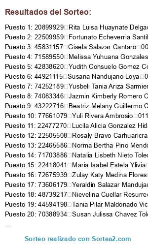 Lista de participantes: 40344560 Abad Rojas Palacios 009, 22486435 Abigail Blanco Martinez 008, 41923957 Ada Yuliana Cal Nieves 001, 43513997 Adelayda Pardave Lazaro 018, 48129146 Adelina Blanco Estela 018, 73589289 Adrian Alvarez Gonzales 008, 22509809 Aide Lazaro Cruz 009, 72120422 Alejandra Stefany Katheri Parra Flores 012, 22527562 Alejandra Trujillo Santos 014, 45399169 Alicia Lidia Barrueta Claudio 011, 48091905 Alila Jusefa Salvador Puente 012, 75212910 Amabela Rios Espinoza 003, 23012235 Ana Bertha Ruiz Vela 006, 44736618 Ana Cecilia Trinidad Nazairo 008, 42422812 Ana Maria Cristobal Rojas 013, 48746784 Ana Maria Nazario Baylon 016, 44115362 Ana Mely Tenazoa Rodriguez 001, 22674149 Anabel Romero Gomez 002, 77200793 Anahi Nayeli Carbajal Martinez 001, 22500257 Andrea Candelario Ramirez 009, 77054212 Andrea Elizabeth Adan Nieto 005, 42728255 Andrea Maribel Zamudio Orbezo 016, 41741978 Angela Miriam Salazar Condezo 017, 46853063 Angelica Cabrera Albornoz 006, 45608134 Angelica Edith Celestino Silvestre 019, 41508960 Angelica Esther Caceres Ramirez 012, 22477254 Angelica Maria Tolentino Leon 018, 47284943 Anyela Espiritu Huaman 005, 20573174187 Arabella Beauty Center Srl 008, 76565245 Aracely Manuela Chocano Avila 013, 42150579 Avi Griselda Aponte Vega 011, 43222716 Beatriz Melany Guillermo Castillo 006, 04017638 Belarmina Espejo Robles 006, 22674386 Belia Maria Meza De Pozo 019, 48199313 Belinda Navarro Hoyos 017, 40309661 Bertha Janett Aliaga Arnedo 005, 46188864 Bertha Maria Ayra Sandoval 012, 46812768 Bethsabe Jorge Templo 019, 71199595 Betsy Olenka Acero Dominguez 012, 46536585 Betsy Paola Solorzano Malpartida 001, 73587009 Betty Casio Liberato 012, 22408901 Blanca Violeta Bustamante Loarte 006, 74933626 Britney Nicol Sanchez Grecia 006, 42532384 Caetana Isla Figueroa 008, 75010710 Camila Ailen Bernaola Santos 010, 44201995 Candelaria Del Pilar Alomia Vitor 009, 42715657 Carina Santos Martin 011, 40945365 Carmen Amelia Cabrera Vela 001, 10341152 Carmen Rosa Castillo Herrera 018, 22413604 Carmen Rosa Urdanivia Ramirez 006, 22485916 Carmen Sadid Pizarro Alvarado 001, 76029196 Carolina Antuanette Beltran Laurencio 017, 73384799 Cassandra Marielena Hinostroza Ramirez 011, 22411654 Catalina Atanacio Bejarano 014, 47051991 Cecilia Katherin Chavez Quijano 005, 22499393 Celia Cruz Aguirre 014, 73208453 Christian Chamorro Meza 016, 46785203 Cindy Mardeliz Pre Guzman 012, 42503202 Cinthya Dolly Zelaya Baldeon 014, 44962691 Cintia Katerin Carhuaz Millan 006, 22487900 Clara Nataly Rivera Matos 018, 22520401 Clelia Gomez Bacilio 009, 45220531 Clelia Retis Fretel 018, 22465397 Clorinda Lusbelia Bravo Figueroa 018, 22403350 Concepcion Valentina Cabanillas Malpartida 013, 75198577 Crisalinda Melissa Cantaro Trinidad 016, 73944184 Dafney Creyssi Pasquel Santos 008, 45498386 Dalila Asto Naupa 006, 47573183 Dalila Justo Aguirre 005, 41411694 Dalmiro Daniel Roque Palpa 014, 41695539 Damaris Enedina Rojas Aranda 001, 41434506 Debbie Denisse Coronel Cotrina 014, 22511188 Delia Cristina Munguia Agui 006, 22963525 Delia Margarita Fabian Rojas 011, 46483744 Delvi Lorenza Atencio Campos 014, 72383312 Devora Sarai Flores Castaneda 002, 44477198 Deysi Aquino Asado 011, 73447273 Deysi Raquel Medina Perez 006, 44782984 Diana Blas Seferino 010, 41372043 Diana Jenny Sabino Garcia 013, 77091026 Diana Lourdes Torres Condezo 002, 43386013 Diana Patricia Mendoza Flores 008, 22742266 Digna Maccha Salazar 014, 22479662 Diosa Linda Asencio Gonzales 005, 22521177 Dolila Campos Mallqui 014, 22409171 Dora Alejandrina Meza De Bernal 008, 22999863 Dora Clemente Ponce 013, 47871736 Dora Guivarra Cierto 003, 46892649 Dyancaro Palpan Valer 002, 22757322 Edelmira Timoteo Adriano 001, 40885150 Edhit Marleny Garcia Jaimes 017, 77504145 Edith Karen Santiago Pio 008, 60270624 Edith Marleni Fabian Calero 018, 72375951 Edith Yasdaly Bartolome Tarazona 008, 22481142 Edith Yeni Soria Malpartida 012, 04058224 Edith Yolanda Sudario Remigio 008, 22483954 Eladia Revolledo De Acosta 019, 22507155 Elcira Lourdes Ferrari Tineo 006, 22431972 Elena Elvira Centeno Quintana 016, 42958076 Elida Rosaura Gomero Ambrosio 013, 22418332 Elisa Del Pilar Taboada Bolarte 012, 41152219 Elizabeth Antonia Marchan Valverde 008, 40631886 Elizabeth Calderon Eduardo 006, 22407259 Elizabeth Cano Villanueva 012, 22508247 Elizabeth Eusebio Segura 011, 22508111 Elizabeth Murrieta Salas 017, 22486634 Elizabeth Nolasco Bravo 011, 22517709 Elizabeth Salazar Crespo 006, 47433974 Elizabeth Sandy Flores Diaz 012, 43056952 Elsa Milagros Fabian Calero 018, 22462327 Enedina Vilma Visag Berrospi 008, 22406381 Epifanio Gaudencio Davila Rivera 009, 42663971 Erika Doris Damian Zevallos 008, 22666532 Erika Escobar Rojas 004, 41588603 Ermelinda Salazar Osorio 010, 22512075 Esperanza Diaz Gallardo 014, 23018935 Estelista Flavia Maylle Garay 006, 72720215 Esthefany Jhenifer Ramos Pinan 017, 43103698 Esther Aranda Mendoza 002, 22521599 Esther Edith Condezo Oncihuay 017, 40462005 Esther Jeny Mediano Aliano 019, 22414183 Eudolinda Elizabeth Jeronimo Rosales 013, 40847636 Eulalia Nazar Reyes 014, 44814555 Eva Luz Coz Nolberto 014, 40554403 Eva Maria Mandujano Papas 012, 42657387 Evalina Dalila Fernandez Huacho 012, 40769891 Evelina Teofila Callupe Sosa De Bonilla 019, 72772466 Evelyn Melani Eulogio Martin 005, 22500023 Falconia Guzman Montanez 012, 22672231 Felicita Quispe Uscamayta 004, 72125779 Fideli Mireya Cajas Orizano 016, 40650715 Filomena Sadith Santillan Gonzales 019, 42111470 Fiorella Milagritos Evangelista Espinoza 001, 71929427 Fiorella Sudario Pablo 003, 71659763 Flor Jhanet Encalada Mendoza 009, 46136532 Flor Maricela Puente Arratea 014, 73786886 Flor Marlita Ayra Rueda 009, 80140654 Flor Paquita Martinez Fabian 008, 45271573 Flora Pilar Barredo Simon 017, 22509959 Fortunato Echeverria Santillan 008, 47113602 Fresly Alicia Perez Aguirre 014, 22503135 Frida Veronica Marrujo Orbezo 018, 46015176 Gabriela Beatriz Bailon Isidro 003, 73905261 Gema Diana Ordonez Martinez 002, 