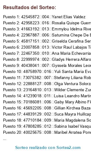 Lista de participantes: 22492928 013 Adela Calero Clemente, 22508088 004 Adriana Eina Nonde Huayta, 45376479 002 Alicia Lopez Sacramento, 74278162 012 Amerly Xiucmara Munoz Vasquez, 22467350 010 Ana Maria Echevarria Figueroa, 09626276 005 Andrea Zelada Alfaro, 47490662 013 Angela Briyith Retis Ramirez, 74093770 008 Anghela Judith Gallegos Santiago, 80445677 006 Arminda Galan Ureta, 45930866 010 Ayda Vilma Bartolome Jara, 41047461 001 Basilia Atanacio Robles, 71244754 013 Betsy Catherine Tineo Durand, 40610977 008 Betty Paola Fernandez Marcelo, 80387802 002 Betzabe Vasquez Zelaya, 23002667 008 Carmen Jara Penadillo, 22997925 002 Cenicia Lorenza Aranda Tolentino, 23019693 007 Cesar Luis Gonzales Zevallos, 42931950 002 Cinthya Johana Perez Rojas, 47080135 006 Cirila Elena Damacio Simon, 22987121 002 Cleda Simon De Grados, 20405588 007 Consuelo Beatriz Ojeda Chavez, 44351546 007 Daniela Rios Reategui, 41223757 008 Denise Roxana Leon Vidal, 74989680 013 Diavelu Soyla Puri Simon, 48806149 002 Digna Tucto Lopez, 22978037 008 Dionicia Aereb Figueredo De Vasquez, 22962176 002 Dominga Melchor Soria, 48510608 013 Edinson Clynton Lino Orizano, 74707968 013 Edith Ambicho Transito, 70032210 013 Edith Marleny Quispe Casimiro, 41554034 007 Elita Marly Leandro Sellado, 22481863 006 Elizabeth Gamarra Rivera, 77035522 004 Elizabeth Gonzales Perez, 23015848 006 Elka Alvarado Escalante, 47456321 008 Emilio Anapan Albornoz, 41663192 013 Emmylou Idelma Rivera Villar, 22421975 005 Enid Zarela Ostos Ferrer, 77712063 006 Erika Bacilio Cecilio, 70122623 014 Esther Encarnacion Laurencio, 73301715 003 Freysi Natali Ramirez Eugenio, 70186081 006 Gaby Mary Albino Flores, 45692205 008 Gillian Kirchea Bazan Zarate, 71561414 002 Gissella Jessica Ochoa Arana, 17923223 006 Gladiz Ytumelia Linares Padilla, 22963532 002 Gladys Elizabeth Salazar Diaz, 22999974 002 Gladys Herrera Alfaro De Salas, 22884065 002 Gloria Ayde Velenzuela Ortiz, 45817151 002 Griselda Cerafina Serna Vargas, 60491035 013 Guisela Luz Maiz Palacios, 40438041 007 Gyssela Morales Leon, 48331818 001 Hayli Breydtha Angulo Ramrez, 42750744 001 Hermelindo Manuel Carlos Durand, 80042300 006 Hermenegilda Espritu Salazar, 76381829 013 Hilda Gamarra Claudio, 76063194 013 Isabel Karina Villar Perez, 45636016 016 Jackelin Vanessa Bendezu Diaz, 43465085 002 Jackelin Zevallos Arostegui, 45192337 002 Jakeline Roxana Arcayo Perez, 76348033 002 Jamir Abel Acosta Huaman, 40936760 007 Janet Nelly Ramos Espritu, 74616147 003 Janeth Gabino Penadillo, 23010989 001 Jenny Maria Polo Trujillo, 43136778 006 Jenny Me Ling Machado Berrospi, 45541138 003 Jessica Junelly Gutierrez Rios, 60439226 006 Joissy Miluska Orrego Estrada, 01188635 013 Jomilla Lozano Ramirez, 80568704 008 Jose Luis Yanay Chilon, 74778896 013 Jose Nolberto Carrillo Ramos, 40358705 007 Josefina Ramirez Vargas, 41228575 006 Judith Advincula Estrada, 46134162 002 Juvina Rosado Yanac, 46854269 007 Katherine Andree Valles Panduro, 40245326 006 Ketty Roxana Runco Gonzales, 45259976 007 Ledys Maiz Paredes, 22973291 006 Leonila Alvarado Navarro, 80039376 014 Leonor Dominguez Trinidad, 40282787 007 Liboria Jorge Santamaria, 00997859 007 Lidia Consuelo Flores Terrones, 73263438 013 Lidia Viviana Ponce Florido, 23155711 002 Lilian Manuelita Pastor Sosa, 45567759 002 Liliana Leonor Mori Parra, 22998233 007 Liliana Sevillano Penaherrera, 47718979 010 Linda Virginia Maiz Romero, 47223114 005 Liseth Roxana Camacho Ostos, 71303605 008 Liz Evelin Orizano Simon, 72389531 013 Lizet Yaritza Nieves Gamarra, 41239018 011 Luisa Leandro Martin, 23019501 007 Luz Elena Rios Viena, 48651446 013 Luz Kelly Chacas Minaya, 75777426 010 Luz Lurda Bautista Maiz, 74924806 013 Luz Mery Clemente Inocente, 48766340 006 Madelin Gyna Apolinario Bravo, 71304078 004 Marbelita Candy Perez Encarnacion, 22996592 004 Maria Magdalena Rojas Trujillo, 47710184 009 Maria Magdalena Soria Ospino, 73300218 005 Maria Mercedes Del Aguila Zelada, 40025675 008 Maribel Arratea Ponce, 46381736 004 Maribel Palomino Ponce, 23001765 007 Maricha Rodriguez Camavilca, 76477479 006 Maricielo Caceres Pizango, 10006801 003 Mariela Arevalo Saboya, 42314344 004 Maritza Gonzales Ortis, 23018754 005 Maritza Meza Tapullima, 76650243 002 Marleni Correa Palomino, 61275472 008 Mary Marilin Ponce Rivera, 10106204719 002 Mercedes Elena Motta Tarazona, 45991523 008 Miladi Ponce Rojas, 40671882 004 Milagros Anapan Quispe, 43328297 014 Milena Castro Ponce, 46869977 014 Miriam Gliceria Alejo Rojas, 41744347 006 Mirian Yovana Ordonez Rodriguez, 47471092 008 Mirza Malu Gonzalez Pinan, 46573522 002 Misly Jhandira Bravo Arostegui, 47148496 001 Nancy Mildret Diego Cubos, 22888127 008 Olga Ventura Solorzano, 44392893 006 Olinda Maria Lazaro Campos, 71565144 002 Oriany Kris Ramirez Ramirez, 72542828 002 Peggi Berenisse Romero Vidal, 74954195 005 Pilar Yessenia Camacho Ostos, 44513910 015 Polonia Miguela Retis Mays, 45186589 008 Priscilla Nohely Alvarado Sanchez, 47240107 007 Raquel Yanina Pedraza Malpartida, 41575577 011 Raul Sumaran Rueda, 48114454 006 Rebeca Carolina Abad Linares, 45559332 008 Rocio Serafin Benancio, 42958223 016 Rosalia Quispe Guerra, 42921971 006 Rosaria Arteta Claudio, 22972803 008 Rosario Lopez De Ortega, 48218497 006 Ruth Raquel Ponce Avila, 47808285 012 Sabina Isabel Vasquez Custodio, 48141669 008 Sarai Tabita Sinche Meliton, 22967887 006 Saturnina Chepe De Espinoza, 47083875 007 Senaquerid Hena Marin Salas De Cubas, 44848479 002 Senia Antonia Lino Aquino, 22987490 006 Soledad Estrada Gamarra, 44429081 002 Sonia Margarita Guerra Salazar, 73075382 007 Stefanny Liliana Robles Sevillano, 74477474 006 Stefany Shirley Tapullima Ariza, 44839129 002 Suca Mayra Huillcapuma Ramos, 76080641 002 Tania Liz Montoro Espinoza, 23007858 013 Victor Raul Labajos Tineo, 22997412 007 Vilma Placido Orneta, 23164810 013 Wilder Clemente Zuniga, 42545872 004 Yanet Elias Valdez, 45069685 014 Yanet Simon Atanacio, 47435270 008 Yeli Elizabeth Ramos Espiritu, 76388062 010 Yenifer Kassandra Prado Sant