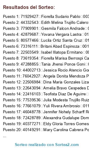 Lista de participantes: 71709037 Alexia Yerly Irribarren Vigilio 001, 21258665 Ana Eulalia Hidalgo Arias 001, 76042927 Angela Donita Mendoza Pimentel 001, 46536585 Betsy Paola Solorzano Malpartida 001, 46939821 Betzabeth Marlene Chavez Bravo 001, 73316111 Britani Abad Espinoza 001, 45464038 Cecilia Pimentel Escobal 001, 73265521 Geydi Dayana Nolasco Lastra 001, 75445600 Jennifer Margarita Zevallos Ardilles 001, 47131344 Johel Leonardo Sobrado Huaquino 001, 40245977 Judith Rosa Gavidia Espinoza 001, 77539536 Julia Modesta Trujillo Ruiz 001, 75630256 Keiko Nicole Escobal Alejo 001, 75726676 Kendy Antony Guerra Amasifuen 001, 22401631 Klenda Rivera Minaya 001, 70683345 Leticia Vanessa Leo Santacruz 001, 40707173 Liz Yovana Moya Machado 001, 43292922 Margarita Calderon Mego 001, 44024844 Maria Elena Trujillo Ruiz 001, 45423545 Marleni Flores Martel 001, 41251004 Mirko Victor Tello Cornejo 001, 22475754 Nanci Lourdes Leon Obregon 001, 22961413 Nancy Gallardo Saavedra 001, 22413517 Nelida Doroteo Hilario 001, 22510419 Nila Efilia Lucas Gonzales 001, 48687796 Pedro Claudio Inga Miraval 001, 22505508 Rosaly Bravo Carhuaricra 001, 42100311 Roxana Karina Vargas Vasquez 001, 47063319 Sheyla Alessandra Figueroa Valqui 001, 44612861 Vladimir Omar Reyes Davila 001, 40661421 Yanet Rosa Papas Alomia 001, 42045863 Yanira Rosalia Alejo Durand 001, 80083994 Yeny Adaia Ochoa Alarcon 001, 22468636 Yolanda Zevallos Carlos 001, 46056144 Yuli Guisela Inga Mirabal 001, 22434871 Donata Cayetano Beraun De Prado 002, 43103698 Esther Aranda Mendoza 002, 73905261 Gema Diana Ordonez Martinez 002, 22674236 Gisella Rosa Francisca Centeno 002, 22640368 Gladis Serrano Jara 002, 42955514 Isabel Rosenda Rivera Illatopa 002, 76156459 Marcelina Karol Soria Ospino 002, 40255586 Nancy Diego Lozano 002, 71623749 Nayeli Soledad Suarez Astupinan 002, 41412133 Rody Soraida Pinto Sipion 002, 04050687 Rosa Melva Fuster Ricse 002, 71269441 Rosmeri Deysi Cruz Rivera 002, 71741201 Wendy Guadalupe Gonzalez Diaz 002, 72308207 Yelton Ponce Serrano 002, 75948011 Yessica Daria Ramirez Condezo 002, 41424904 Yolanda Isabel Silverio Bravo 002, 71929427 Fiorella Sudario Pablo 003, 40929148 Florecilla Ayde Espinoza Sabrera 003, 45514313 Gino Jose Davila Sabrera 003, 45805006 Luz Marleni Claudio Roque 003, 75710649 Nelida Mabela Picon Luis 003, 22894723 Nora Mercedes Soto Leon 003, 71924093 Rosmerin Yasmin Espinoza Pinedo 003, 71931144 Sarit Espinoza Pinedo 003, 22643094 Amelia Bravo Cespedes De Orbezo 004, 08399334 Isabel Eufrosina Chavez Lagos 004, 22503549 Isabel Illatopa Ermitano 004, 76338079 Jimena Camila Carhuallanki Nolasco 004, 40448757 Johan Jano Orbezo Bravo 004, 70764723 Katerine Monica Lucas Sanchez 004, 22666518 Marisol Garcia Calero 004, 71078800 Mavila Zahori Luciano Rivera 004, 71474655 Milagros Ysabel Alvarado Chavez 004, 44668278 Noemi Magdalena Isarra Martel 004, 04064042 Valentina Eusebia Cornejo Casas 004, 73617149 Yanet Florencia Ramirez Condezo 004, 47051991 Cecilia Katherin Chavez Quijano 005, 47573183 Dalila Justo Aguirre 005, 44074980 Elizabeth Murga Huerta 005, 42402455 Elvira Paredes Alvarez 005, 75237709 Eugenia Javier Garcia 005, 44083909 Feby Mavet Espiritu Encarnacion 005, 44770127 Guicela Llanos De Lao 005, 47696977 Jhazmin Jimena Ortega Tarazona 005, 44468563 Leenin Toni Casio Justo 005, 72912410 Linfa Dorcas Hidalgo De Lao 005, 48484267 Liz Beatriz Aguirre Huaman 005, 40355063 Olnida Gomez Concha 005, 40109237 Sandra Gabriela Beraun Pio 005, 76737798 Yolanda Elvira Sanchez Pariacuri 005, 42838620 Yudith Consuelo Gomez Colonia 005, 46853063 Angelica Cabrera Albornoz 006, 003201487 Dairelys Haidee Escobar Tua 006, 22511188 Delia Cristina Munguia Agui 006, 40377271 Eldy Gloria Torres Gomes 006, 22512020 Frydisvinda Reyda Cervantes Tarazona 006, 22512280 Gilda July Espejo Robles 006, 73298351 Gloria Quijano Espinoza 006, 22421213 Gudelia Suarez Rodriguez 006, 80122882 Judith Cueva Salgado 006, 43680114 Karla Consuelo Gomez Alvarado 006, 22488595 Luz Roxana Crespo Lugo 006, 22674497 Macario Alfredo Tucto Santiago 006, 22420435 Maria Castillo Quispe 006, 22505587 Milagros Chamorro Ampudia 006, 45517165 Monica Gabriela Carbajal Soto 006, 22403432 Nelida Teofila Cabrera De Ribera 006, 71617666 Nicolle Alexandra Fermin Gonzales 006, 41669350 Patricia Ponce Leon 006, 22674216 Rosa Luz Avila Lopez 006, 76513915 Shina Giovana Simon Atavillos 006, 40202017 Tania Maribel Barnardo Lopez 006, 22488364 Vilma Ponce Rivera 006, 47973842 Wini Yoscelin Montalvo Cotrina 006, 22435779 Zenaida Isabel Adrian Sanchez 006, 40344560 Abad Rojas Palacios 008, 04058224 Edith Yolanda Sudario Remigio 008, 06623197 Escolastica Chavez Cardenas 008, 22701057 Felicitas Lino Norena 008, 42106568 Flor De Belen Reategui Flores 008, 22407371 Ivonne Maritza Ramirez Claud 008, 43779574 Jesica Diana Osorio Caldas 008, 45833872 Lely Gomez Alvarez 008, 74735967 Leonardo James Concha Olivares 008, 22664344 Liliana Zevallos Avila 008, 44587761 Liz Karen Ramirez Castro 008, 22507206 Luisa Celia Casique Fernandez 008, 76576094 Magaly Melina Verde Malpartida 008, 48127243 Maria Rosario Cloud Castro 008, 73367601 Maria Yolanda Cruz Solis 008, 73352677 Marilita Crispin Trujillo 008, 22464163 Martha Lastra Galvez 008, 22508389 Maruja Mendieta Huaytan 008, 04307308 Matilde Principe Rodriguez 008, 22511180 Nathalie Violeta Paz Martel 008, 04051037 Nelida Gudelia Fuster Ricse 008, 22425699 Noemi Rosa Pozo Nunez De Mendoza 008, 22476488 Noimi Ruth Fonseca Livias 008, 45351761 Paula Mego Tulumba 008, 22429385 Rita Aparicia Lobaton Castaneda 008, 47485711 Rocio Mayumi Atanacio Calderon 008, 22506509 Rosa Alicia Alvarado Lino 008, 43553663 Roxana Salazar Santillan 008, 22509725 Sara Virginia Figueroa Arce 008, 70322200 Tatiana Paola Rojas Orna 008, 73181918 Brighit Rosalinda Villanueva Maylle 009, 44201995 Candelaria Del Pilar Alomia Vitor 009, 77909901 Gesmila Falcon Andrade 009, 22474224 Gladis Otilia Solorzano Armas 009, 70007908 Janela Lucero Cotrina Atencia 009, 4605