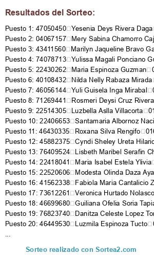 Lista de participantes: 40344560 Abad Rojas Palacios 008, 48129146 Adelina Blanco Estela 018, 74361666 Aide Elvia Raymundo Hilario 013, 45282630 Alejandrina Hermelinda Borja Lopez 013, 21258665 Ana Eulalia Hidalgo Arias 001, 42728255 Andrea Maribel Zamudio Orbezo 016, 75251428 Andrea Priscila Gutierrez Pianan 019, 46501661 Andres Christian Aponte Abad 014, 43251495 Andy Isabel Solorzano Tarazona 013, 41741978 Angela Miriam Salazar Condezo 017, 71305833 Angelina Giovani Escobal Aguero 009, 76208912 Araceli Mishell Vidal Encarnacion 018, 45408268 Aurelia Pilar Trujillo Correa 016, 22460023 Aurora Chamoli Canturin 004, 75188283 Berita Escobal Martel 002, 22476491 Bertha Lida Sanchez Mori 011, 71199595 Betsy Olenka Acero Dominguez 012, 40790281 Blanca Rosa Alva Duran 011, 45991504 Carla Esteban Ponce 001, 73384799 Cassandra Marielena Hinostroza Ramirez 011, 48489706 Claudia Betzabe Tolentino Santiago 001, 22520401 Clelia Gomez Bacilio 009, 45882375 Cyndi Sheley Ureta Hilario 011, 40615874 Dalila Illatopa Espinoza 011, 76823740 Danitza Celeste Lopez Torres 013, 45815494 Delia Valerio Milla 002, 40416864 Diana Baylon Rivera 008, 23141340 Dionisio Alania Sumaran 005, 75465359 Dorcas Sarai Ricopa Ramos 019, 45665758 Edith Picoy Carhuas 013, 40089760 Elida Gutierrez Franco 012, 73179373 Elizabeth Jael Serafico Cervantes 011, 22486634 Elizabeth Nolasco Bravo 011, 22517709 Elizabeth Salazar Crespo 006, 22487486 Elsa Edy Orizano Leives 013, 22474876 Emma Rosario Rivera Miraval 011, 22512573 Enrique Mariano Melgar Sanchez 012, 73249081 Erika Evelin Panez Victorio 006, 40652747 Erika Pilar Rodriguez Figueroa 004, 00996361 Esther Saavedra Jaramillo 013, 76869675 Eyleen Lourdes Robles Cajas 012, 41562338 Fabiola Maria Cantalicio Zambrano 013, 71929427 Fiorella Sudario Pablo 003, 42980119 Flor Cecilia Ferrer Escobar 014, 25846954 Flor Selene Sanchez Solis 006, 44206546 Gabriela Dialu Panduro Quinto 009, 22474224 Gladis Otilia Solorzano Armas 009, 19921805 Gladys Aydee Sosa Pinto 001, 22491668 Guadalupe Pardo Norena 013, 22421213 Gudelia Suarez Rodriguez 006, 44770127 Guicela Llanos De Lao 005, 46699680 Guiliana Ofelia Soria Tapia 001, 45284400 Harry Ramos Pinan 017, 44305208 Herminia Urbano Javier 001, 22400591 Hortencia Zevallos Garcia 001, 46264233 Ibeth Teresa Lozano Leon 012, 42948918 Jacinta Delinda Quispe Pineda 003, 46971829 Jair Chavez Villanueva 008, 46034611 Jane Karen Valdes Trujillo 014, 75423453 Jasmin Ana Aguilar Espinoza 010, 74083346 Jazmin Kimberly Romero Cori 014, 76732067 Jhon Waldir Herrera Matto 008, 46039305 Jhonattan Jose Marquez Ruiz 011, 48556100 Jorge Luis Albornoz Soto 005, 47797978 Juana Aponte Munos 011, 80122882 Judith Cueva Salgado 006, 40245977 Judith Rosa Gavidia Espinoza 001, 46502992 Karen Milagros Rojas Aponte 005, 42919137 Karina Chavez Soto 014, 70679969 Karla Nalvarte Salazar 013, 72946216 Kevin Edward Travezano Vila 012, 76409524 Lisbeth Maribel Serafin Chavez 011, 22477567 Lucia Del Rosario Mory Vara 011, 71272399 Luciana Esther Portillo Mori 011, 80156800 Luis Alberto Salazar Rojas 005, 41637511 Luz Clarivel Tecco Alcedo 017, 22488595 Luz Roxana Crespo Lugo 006, 22514305 Luzbella Aslla Villacorta 011, 46449530 Luzmila Espinoza Tucto 019, 21132807 Maria Esperanza Moreno Quispe 017, 22430262 Maria Espinoza Guzman 017, 22720629 Maria Estela Enrique Rosales 006, 04016180 Maria Haydee Lazarte De Verastegui 013, 22418041 Maria Isabel Estela Ylivia 008, 46044260 Maria Joaquina Pozo Fretel 002, 73367601 Maria Yolanda Cruz Solis 008, 47642562 Maribel Felicita Chavez Alejo 002, 40097458 Maribel Santos Neyra 011, 72365670 Mariela Anali Talancha Encarnacion 002, 43411560 Marilyn Jaqueline Bravo Garcia 006, 43107651 Marisol Rossana Ortega Buitron 001, 46024556 Marivel Jaimes Mallqui 003, 74077803 Marleny Romero Espiritu 013, 40149291 Mary Carolina Cabrera Ponce 014, 71078800 Mavila Zahori Luciano Rivera 010, 47099771 Mayumi Lizeth Bravo Acosta 017, 73596038 Mayumi Naomi Valdivia Cajas 009, 74419012 Medalid Yalila Cajas Majino 009, 71654974 Melissa Grisel Morales Salvador 019, 47263889 Meliza Milca Vela Rosales 003, 04024286 Mercedes Beatriz Aranda Fretel De Janampa 008, 04067157 Mery Sabina Chamorro Cajahuaman 013, 22671964 Milagritos Ninfa Arnedo Espinoza 002, 41037254 Milagros Amado Soto 001, 40394615 Milagros Del Pilar Sandoval Silvestre 006, 46967453 Miranda Olga Cabello Salas 014, 41251004 Mirko Victor Tello Cornejo 001, 22520606 Modesta Olinda Daza Ayapi 018, 22475754 Nanci Lourdes Leon Obregon 001, 22961413 Nancy Gallardo Saavedra 001, 45581326 Nancy Katherine Benancio Vasquez 001, 47736020 Nancy Vega Sifuentes 001, 44443308 Nela Yuly Chavez Bustamante 019, 72037832 Nelcy Isabel Felix Mejia 009, 04051037 Nelida Gudelia Fuster Ricse 008, 22480756 Nely Yanesi Cabrera Condezo 008, 71944713 Nilda Ericka Rojas Padilla 013, 40108432 Nilda Nelly Rabaza Mirada 009, 77073448 Nnitsbeth Nnicole Janampa Gonzales 002, 47818491 Noemi Cintia Ventura Tadeo 019, 44668278 Noemi Magdalena Isarra Martel 002, 22476488 Noimi Ruth Fonseca Livias 008, 48864142 Olga Jenni Acosta Converzo 012, 43057552 Oliveria Laurencio Enrique 006, 41669350 Patricia Ponce Leon 006, 48687796 Pedro Claudio Inga Miraval 001, 42677545 Riquelme Sajami Romaina 008, 22506509 Rosa Alicia Alvarado Lino 008, 80591506 Rosa Maria Chamorro Tarazona 009, 01009961 Rosalinda Mozombite Galan 002, 71269441 Rosmeri Deysi Cruz Rivera 002, 71924093 Rosmerin Yasmin Espinoza Pinedo 003, 46430335 Roxana Silva Rengifo 016, 22518507 Ruth Maribel Chavez Eulogio 004, 48348342 Sandra Abelinda Barreto Villegas 016, 40109237 Sandra Gabriela Beraun Pio 005, 22406653 Santamaria Albornoz Nacion 011, 40804002 Sara Luz Yurivilca Julca 010, 22509725 Sara Virginia Figueroa Arce 008, 44027843 Sendy Neylu Montes Vara 011, 73589286 Sheyla Cristina Martel Enrique 001, 73305886 Skarly Brigitte Huallanca Cespedes 003, 22889595 Sofia Vitalia Aquilino Huanca 013, 73603852 Soledad Maria Tineo Vega 013, 22413227 Sonia Ponce Ramirez 008, 46434228 Sulca Tuct