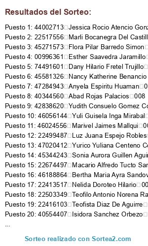 Lista de participantes: 40344560 Abad Rojas Palacios 008, 22643094 Amelia Bravo Cespedes De Orbezo 002, 21258665 Ana Eulalia Hidalgo Arias 001, 42728255 Andrea Maribel Zamudio Orbezo 016, 75251428 Andrea Priscila Gutierrez Pianan 019, 41741978 Angela Miriam Salazar Condezo 017, 47284943 Anyela Espiritu Huaman 005, 07256530 Basilia Dionicia Santi Seis 002, 73582962 Belinda Skarlet Ramirez Juancho 005, 75188283 Berita Escobal Martel 002, 40309661 Bertha Janett Aliaga Arnedo 005, 22476491 Bertha Lida Sanchez Mori 011, 46188864 Bertha Maria Ayra Sandoval 012, 41582531 Bina Levi Cotrina Carlos 002, 72260085 Brigitt Lucero Soto Acosta 014, 22520401 Clelia Gomez Bacilio 009, 71078722 Cris Yanett Valerio Milla 002, 76823740 Danitza Celeste Lopez Torres 013, 74491601 Dany Hilario Fretel Trujillo 010, 76263476 David Azado Castro 016, 22511188 Delia Cristina Munguia Agui 006, 42100983 Delia Dalila Vargas Rimac 014, 41372043 Diana Jenny Sabino Garcia 013, 40554432 Elizabet Marilin Cusqui Zevallos 016, 22512573 Enrique Mariano Melgar Sanchez 012, 71451389 Erika Ramirez Romero 010, 77037489 Estefany Daniela Bocanegra Maiz 016, 00996361 Esther Saavedra Jaramillo 013, 41562338 Fabiola Maria Cantalicio Zambrano 013, 42980119 Flor Cecilia Ferrer Escobar 014, 45271573 Flora Pilar Barredo Simon 017, 44652492 Fredy Inocente Segovia 010, 44206546 Gabriela Dialu Panduro Quinto 009, 74084623 Gaby Carmely Acosta Avila 005, 22512280 Gilda July Espejo Robles 006, 22474224 Gladis Otilia Solorzano Armas 009, 22429333 Gloria De La Cruz Vda De Estacio 005, 46699680 Guiliana Ofelia Soria Tapia 001, 80646729 Hermelinda Castillo Vicente 002, 44342719 Hermelinda Ponce Gomez 017, 40554407 Isidora Sanchez Orbezo 002, 41051344 Jackeline Susan Laos Coz 013, 23011872 Janeth Sofia Garay Dominguez 004, 44002713 Jessica Rocio Atencio Gonzales 018, 73303165 Jheydi Alexandra Trujillo Nunez 002, 40245977 Judith Rosa Gavidia Espinoza 001, 46502992 Karen Milagros Rojas Aponte 005, 70679969 Karla Nalvarte Salazar 013, 22488806 Ketty Carranza Crespo 013, 47681365 Lesly Karen Figueroa Cristobal 002, 73134114 Liliana Del Pilar Meza Casaico 014, 44929775 Lisbet Paulina Rivera Vicente 002, 70033471 Liz Jakeline Hidalgo Celis 014, 40613778 Liz Lissbeth Alvarez Pajuelo 011, 43289357 Lola Neumi Rosario Robles 011, 41637511 Luz Clarivel Tecco Alcedo 017, 22499487 Luz Juana Espejo Robles 006, 22674497 Macario Alfredo Tucto Santiago 006, 76874881 Madelay Criollo Tarazona 012, 46104658 Mara Nancy Arqueno Illatopa 013, 22659326 Margarita Ponce Fabian 017, 21132807 Maria Esperanza Moreno Quispe 017, 04016180 Maria Haydee Lazarte De Verastegui 013, 48232572 Maria Mercedes Illatopa Cardenas 006, 47642562 Maribel Felicita Chavez Alejo 002, 46024556 Marivel Jaimes Mallqui 003, 22517556 Marli Bocanegra Del Castillo 013, 42178548 Martina Andrade Fretel 010, 22664643 Martina Garcia Reyes De Martel 002, 71078800 Mavila Zahori Luciano Rivera 010, 47099771 Mayumi Lizeth Bravo Acosta 017, 22527662 Mery Silvia Morales Livia 006, 22475754 Nanci Lourdes Leon Obregon 001, 22961413 Nancy Gallardo Saavedra 001, 45581326 Nancy Katherine Benancio Vasquez 001, 22413517 Nelida Doroteo Hilario 001, 04212515 Nely Pantaleon Leon 013, 72368062 Noimi Campos Villanueva 013, 22476488 Noimi Ruth Fonseca Livias 008, 22420006 Norma Lucy Marin Huere 004, 10256226 Orlando Torres Deudor 017, 48687796 Pedro Claudio Inga Miraval 001, 16697051 Ricardina Aurora Vasquez Cubas 006, 44300961 Ronel Edgar Bravo Figueroa 013, 71269441 Rosmeri Deysi Cruz Rivera 002, 71223197 Sandra Nataly Medrano Bonilla 006, 73603852 Soledad Maria Tineo Vega 013, 45344243 Sonia Aurora Guillen Aguirre 004, 70388934 Susan Julissa Chavez Toledo 006, 22487587 Susy Luz Alvarez Vara 006, 76529929 Tabita Flores Durand 013, 70322200 Tatiana Paola Rojas Orna 008, 22503349 Teofilo Antonio Norena Ramirez 004, 22416103 Teofista Diaz De Aguirre 004, 22498223 Veronica Jacqueline Mesa Estrada 011, 47449231 Veronica Wendy Soto Vigo 018, 44612861 Vladimir Omar Reyes Davila 001, 76931601 Yanina Santa Cruz Ponciano 013, 76594512 Yaritza Dyanna Rojas Atencia 005, 80083994 Yeny Adaia Ochoa Alarcon 001, 42463494 Yeny Doris Chavez Heredia 014, 73645164 Yesica Carlos Tolentino 006, 22997806 Yolanda Jaimes Remigio 014, 42838620 Yudith Consuelo Gomez Colonia 005, 46056144 Yuli Guisela Inga Mirabal 001, 47020412 Yurico Yuliana Centeno Coz 017, 75956515 Zahid Miguel Rivera Cierto 005.