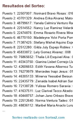 Lista de participantes: 40344560 Abad Rojas Palacios 009, 41264234 Abel Espinoza Martinez 006, 22515479 Agustina Gaspar Valerio 006, 74361666 Aide Elvia Raymundo Hilario 013, 22527562 Alejandra Trujillo Santos 014, 75003898 Alexsandra Yanira Ferrer Rojas 012, 44215019 Amarut Amarilis Maylle Mendoza 017, 22643094 Amelia Bravo Cespedes De Orbezo 004, 42422812 Ana Maria Cristobal Rojas 013, 22487517 Ana Maria Rubio Malpartida 011, 41638774 Ana Monica Pardave Vergara 018, 43701329 Andrea Erika Alvarez Matos De Monge 011, 41741978 Angela Miriam Salazar Condezo 017, 46853063 Angelica Cabrera Albornoz 006, 45608134 Angelica Edith Celestino Silvestre 019, 22477254 Angelica Maria Tolentino Leon 018, 22507493 Angelica Ruth Marin Borunda 012, 42945689 Anhyela Lizbeth Solano Ramirez 013, 70800914 Anmd Jagger Kesvy Hurtado Pimentel 013, 47284943 Anyela Espiritu Huaman 005, 22509665 Asalia Dominga Mendoza Pozo 008, 74352676 Beatriz Matos Eusebio 011, 22960314 Berdith Avila Ramirez 008, 06279096 Bertha Gladys Nieves Vela 012, 40309661 Bertha Janett Aliaga Arnedo 005, 22476491 Bertha Lida Sanchez Mori 011, 22414062 Bertha Ordonez Leon 014, 73275022 Betsy Victoria Ponciano Lopez 008, 71059766 Betty Ingrit Lazo Aliaga 005, 46561957 Birluzbeth Wanashira Tarazona Minaya 013, 22408901 Blanca Violeta Bustamante Loarte 006, 44503816 Bleidy Leidy Lopez Victorio 006, 73181918 Brighit Rosalinda Villanueva Maylle 009, 42532384 Caetana Isla Figueroa 008, 44201995 Candelaria Del Pilar Alomia Vitor 009, 22400336 Carmen Ortiz Salas 016, 10341152 Carmen Rosa Castillo Herrera 013, 71316093 Carmen Rosa Trujillo Condezo 002, 76029196 Carolina Antuanette Beltran Laurencio 017, 40247784 Catty Nancy Huanca Isidro 001, 45464038 Cecilia Pimentel Escobal 001, 44044675 Celedonia Ana Huamali Cridostomo 019, 41776363 Cinthia Carmela Salcedo Davila 004, 42503202 Cinthya Dolly Zelaya Baldeon 014, 22703360 Clelia Cueva Tucto 008, 42938131 Consuelo Corazon Estacio De La Cruz 011, 76576054 Cresia Berrospi Sanchez 012, 22426519 Dadeyva Medina Castaneda 008, 003201487 Dairelys Haidee Escobar Tua 006, 45498386 Dalila Asto Naupa 006, 47573183 Dalila Justo Aguirre 005, 40890992 Delcy Wilfreda Chahua Espinoza 016, 44477198 Deysi Aquino Asado 011, 41372043 Diana Jenny Sabino Garcia 013, 70851343 Diana Minoska Soto Palomino 013, 43484365 Dina Luz Davila Tuanama 001, 44652476 Dina Vega Llagas 014, 22479662 Diosa Linda Asencio Gonzales 005, 47025708 Doris Prudencio Roman 013, 41633608 Edith Laura Ayzanoa Vizcarra 012, 40536574 Edith Osvita Mautino Espinoza 012, 72375951 Edith Yasdaly Bartolome Tarazona 008, 42606653 Edith Yavana Albornoz Tucto 013, 40680837 Elcira Lozano Castro 002, 40694979 Elizabeth Doris Yalico Flores De Hurtado 017, 22508247 Elizabeth Eusebio Segura 011, 42741257 Elizabeth Roxana Huaqui Alvarado 016, 22477050 Elsa Aquino Maiz 008, 75996788 Elva Rosita Luna Chaupis 012, 74085044 Elvira Cervantes Felix 013, 22474876 Emma Rosario Rivera Miraval 011, 22512573 Enrique Mariano Melgar Sanchez 012, 77037489 Estefany Daniela Bocanegra Maiz 016, 47422537 Ester Livia Ramos 008, 00996361 Esther Saavedra Jaramillo 013, 75237709 Eugenia Javier Garcia 005, 42657387 Evalina Dalila Fernandez Huacho 012, 22672231 Felicita Quispe Uscamayta 004, 22891612 Filomena Raymundo Quispe 014, 42106568 Flor De Belen Reategui Flores 008, 22509959 Fortunato Echeverria Santillan 008, 77909901 Gesmila Falcon Andrade 009, 40343750 Gianina Lisbet Cornejo Llato 019, 22512280 Gilda July Espejo Robles 006, 42067045 Gioliana Tapullima Isuiza 005, 22494587 Giovana Silvia Salgado Cardenas 008, 22674236 Gisella Rosa Francisca Centeno 002, 22419655 Gladis Escobal Huerto 008, 22474224 Gladis Otilia Solorzano Armas 009, 43591643 Gladys Celina Zuniga Tolentino 018, 48819464 Gladys Lopez Diestra 011, 73298351 Gloria Quijano Espinoza 006, 76034024 Graciela Castillo Murga 011, 22491668 Guadalupe Pardo Norena 013, 42506208 Herlmer Huaman Meza 012, 22419627 Hilda Concepcion De Hidalgo 017, 22432731 Hilda Judith Ramos Paucar 014, 23168767 Humbelina Sandoval Rojas 012, 44864682 Indhira Zinaida Chavez Gomez 019, 22474948 Ines Rosa Fabian Esteban 011, 22400169 Isabel Millan Mori 011, 22407371 Ivonne Maritza Ramirez Claud 008, 80490015 Jacqueline Juliana Bartra Alvarado 001, 40422574 Jacqueline Marleni Tarazona Rojas 001, 46034611 Jane Karen Valdes Trujillo 014, 76253384 Jazmin Angela Tacuche Ventura 019, 74083346 Jazmin Kimberly Romero Cori 014, 75445600 Jennifer Margarita Zevallos Ardilles 001, 46048778 Jennifer Nohely Scharff Reategui 016, 43779574 Jesica Diana Osorio Caldas 008, 44002713 Jessica Rocio Atencio Gonzales 018, 71923898 Jhamile Jhelene Arrue Murrieta 012, 42250339 Jharitza Jhulie Quijano Malpartida 018, 46039305 Jhonattan Jose Marquez Ruiz 011, 72536364 Jhoysi Mischel Espinoza Rodriguez 012, 76338079 Jimena Camila Carhuallanki Nolasco 004, 40422556 Joanna Melissa Orbezo Bravo 004, 45562929 Jobeth Mariela Leandro Cecilio 017, 40448757 Johan Jano Orbezo Bravo 004, 29398684 Juana Lida Salazar Mendoza 008, 77539536 Julia Modesta Trujillo Ruiz 001, 47769225 Justina Reyna Trujillo Ruiz 001, 46052927 Karina Yudith Santos Apac 009, 70679969 Karla Nalvarte Salazar 013, 70764723 Katerine Monica Lucas Sanchez 004, 47494257 Katherin Yelitza Romero Malpartida 012, 46184643 Katterin Rosa Espiritu Zarate 011, 75630256 Keiko Nicole Escobal Alejo 001, 42645224 Kely Espinoza Cruz 017, 80036032 Ketty Britt Isidro Brancacho 008, 22401631 Klenda Rivera Minaya 001, 73638938 Leila Yamilee Aguirre Penadillo 014, 45833872 Lely Gomez Alvarez 008, 73774840 Leslie Yeneree Ramirez Aguirre 009, 72641265 Leydi Estefanny Rojas Gonzales 006, 47534661 Leydi Karol Flores Albornoz 012, 71850688 Leyli Lesly Cercedo Duran 012, 22664344 Liliana Zevallos Avila 008, 47668560 Linda Flor Carhuaricra Moya 006, 77694420 Liz Claudia Canteno Gaspar 006, 42702556 Liz Jenny Santiago Alcedo 017, 47377750 Liz Mileni Polinar Duran 016, 22509540 Liza Monica Tarazona Acosta 001, 46770757 Lucero Lizeth Aquino Pinto 019