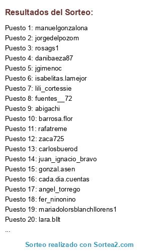 Sorteo con 50 ganadores y 50 suplentes. Los 50 primeros son ganadores y se irá seleccionando los suplentes de forma consecutiva cuando proceda.