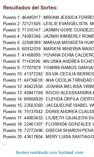 Lista de participantes: 45913774 ADA DAMARIS UGARTE ARRATEA 016, 22427832 ALBINA GOMEZ GONZALES 014, 75003898 ALEXSANDRA YANIRA FERRER ROJAS 012, 22872101 ALFREDA JARAMILLO BARRIONUEVO 006, 41601609 ALFREDO VALOIS DOMINGUEZ ROSALES 009, 40618293 ALICIA SOLANO CORCINO 009, 22422294 ANA DEL ROSARIO TRUJILLO CHAVEZ 012, 70206150 ANDERSON JESUS FLORES COTRINA 010, 76214824 ANGEE BRIGGITH PALACIOS CHEPE 002, 47284943 ANGELA ESPIRITU HUAMAN 010, 43566852 ANGELA MILY SALAZAR FIGUEROA 008, 22477254 ANGELICA MARIA TOLENTINO LEON 019, 22507493 ANGELICA RUTH MARIN BORUNDA 012, 72485336 ANGIE BLAS MEDRANO 010, 45132214 ANTONIO CESAR TORRES CANZAYA 004, 22879760 ASUNCIONA ARANGO ORTEGA 016, 75445267 AYDA DORINA LEANDRO AQUINO 017, 22489028 AYDEE LEON MASGO 010, 40489636 AYLENSY RIBERA RAMIREZ 006, 04014916 BAUTA AQUILH CARHUAZ VALENTIN 013, 22674804 BELINDA JOSEFINA RUIZ BLACIDO 004, 72165749 BETHSSY MILAGROS ALPES SIFUENTES 017, 46778189 BETZABETH CARMEN MORENO HERRERA 002, 22517467 BLANCA DENY NOBLEJAS CABRERA 006, 40790281 BLANCA ROSA ALVA DURAN 016, 44201995 CANDELARIA DEL PILAR ALOMIA VITOR 017, 45054082 CECILIA REYES POLINO 006, 42503202 CINTHYA DOLLY ZELAYA BALDEON 014, 76126553 CYNTIA FIORELLA CONTRERAS PRETEL 019, 41411694 DALMIRO DANIEL ROQUE PALPA 014, 41798672 DENCY ORTIZ PONCIANO 006, 43721420 DENI LUCIA QUISPE RAMOS 014, 73447273 DEYSI RAQUEL MEDINA PEREZ 006, 73447273 DEYSY MEDINA PEREZ 006, 44782984 DIANA BLAS SEFERINO 010, 22507309 DIANA ESTHER SOTO COZ 013, 41086178 DIANA LIZBETH DAZA PEREZ 007, 46384680 DINA LIZBET GOMEZ CARPIO 017, 22434871 DONATA CAYETANO BERAUN DE PRADO 002, 47025708 DORIS PRUDENCIO ROMAN 013, 04058224 EDITH YOLANDA SUDARIO REMIGIO 008, 22507155 ELCIRA LURDES TINEO 006, 22675024 ELENA HUAMAN AVILA 004, 73141225 ELIAM NOEMI PAUCAR REQUELME 016, 22418332 ELISA DEL PILAR TABOADA BOLARTE 012, 44278184 ELISABETH MONICA ORNETA COLLAZOS 008, 76287034 ELIUD FILADELFIA MASGO DURAN 012, 80145052 ELIZABETH CARHUAMACA HUALLPA 014, 22485364 ELIZABETH CRISTOBAL DE LA CRUZ 006, 22487486 ELSA EDY ORIZANO LEIVES 013, 22468906 ELSA LUSMILA VALDIVIESO APAC 013, 45205780 ENEDINA HUAMAN SANTACRUZ 004, 45205780 ENEDINA HUAMAN SANTACRUZ 004, 44342676 ENY GABY DIAZ SALGADO 006, 22666532 ERIKA ESCOBAR ROJAS 004, 22513466 ERLINDA IRRIBARREN JURADO 008, 22497160 ERLINDA NOLASCO BRAVO 016, 41588603 ERMELINDA SALAZAR OSORIO 017, 22460393 ERNESTINA GERRA MORALES 016, 71305783 ESMELY NINOSKA LEON BARRUETA 002, 74686189 ESMERALDA GOMEZ MEDINA 010, 74657368 ESTALITA ALIDA BENANCIO GREGORIO 007, 72102835 ESTHER MOLINA CORPUS 019, 72295141 ESTRELLA LUCERO NUNEZ VELEZ DE VILLA 013, 76726466 ETIGEL MAIZ CUENCA 006, 76726466 ETIGIEL NAIZ CUENCA 006, 22414183 EUDOLINDA ELIZABETH JERONIMO ROSALES 013, 62002584 EVA LUZ JAVIER AGUERO 012, 46226874 EVELYN TATIANA VASQUEZ PAJUELO 006, 42687593 FATIMA ELEXIMIA MONTERO FOLLEGATI 019, 42914866 FEDERICO GILBERTO MIRANDA PINEDA 007, 77387432 FERNANDO TADEO TARAZONA 010, 73124741 FIORELLA SONIA CAMARA RIOS 010, 73786886 FLOR MARLITA AYRA RUEDA 007, 22461307 FLORINDA GONZALES VENTURO 012, 22509959 FORTUNATO ECHEVERRIA SANTILLAN 008, 76750170 GABRIELA VICENTA MONTES CODOY 010, 22497466 GENOVEVA NANCY SARMIENTO HUERE 001, 22489566 GINA DEL PILAR MAURICIO ENCARNACION 008, 43591643 GLADYS CELINA ZUNIGA TOLENTINO 010, 44164901 GLORIA CELIA PANTOJA RAMIREZ 014, 41081022 GLORIA ELENA BRUNO VALDIVIA 014, 73298351 GLORIA QUIJANO ESPINOZA 006, 72772496 GRECIA SHARON PENADILLO RIVERA 016, 76932083 GREIZ MADELEINE PEREZ LEON 014, 22497064 GRIMANESA ROSA ANAYA ESPINOZA 007, 22491668 GUADALUPE PARDO NORENA 010, 47547655 GUIULIANA BEATRIZ MALLQUI ENCARNACION 012, 22486912 HERMELINDA CAJAS MERINO 010, 22527283 HERMELINDA TITO HUAMAN DE LLERENA 012, 43497974 HERMINIA TARCILA FIGUEROA JAMANCA 014, 22878708 HILDA AGUIDA VALDIVIA FRETEL 007, 22432731 HILDA JUDITH RAMOS PAUCAR 014, 62273146 INES IRENE ALVARADO UGARTE 007, 71660046 INGRID SELENE ACUNA CRESPO 016, 71892418 INGRID YASMINDA RAMIREZ RETIS 010, 47083872 IRIS KARINA PRADO CAYETANO 004, 47083872 IRIS KARINA PRADO CAYETANO 004, 80021514 JACINTA SALAZAR CAYETANO 002, 22503260 JACQUELINE ISABEL VASQUEZ ESCOBAL 001, 72470570 JAFIA PENA VELEZ DE VILLA 001, 45779764 JAIME GONZALES CALLA 016, 75854158 JANETH MERY SALAS DURAN 009, 46048778 JENNIFER NOHELY SCHARFF REATEGUI 016, 42459647 JENNY LAVADO SANTIAGO 012, 22476818 JENNY SANCHEZ ALVARADO 012, 22460722 JENY LOZAN TANJUN 006, 71919379 JESSICA ELENA FRETEL CASTILLO 006, 22408713 JESUS LEONOR MARTINEZ REYES 001, 76873786 JHENSEN CLEDY DURAND CONE 006, 45562929 JOBETH MARIELA LEANDRO CECILIO 017, 45776817 JOSE LUIS CALERO SERRANO 004, 76046138 JOSEFINA BARRETO ARMILLON 009, 47012513 JOSSY FIORELLA SILVA SERNA 007, 80122882 JUDITH CUEVA SALGADO 017, 42371674 JUDITH GLADYS PABLO ROJAS 007, 40245977 JUDITH ROSA GAVIDIA ESPINOZA 001, 41496710 JUDITH SOTO AYALA 016, 42736187 JULIA MAGALY POLINO SANCHEZ 017, 76548688 KAREN LUCERO CRUZ ORTIZ 017, 43680114 KARLA CONSUELO GOMEZ ALVARADO 006, 70679969 KARLA NALVARTE SALAZAR 013, 70340941 KATHERINE PIERINA GONZALES MENDOZA 012, 45042065 KELY MORALES HERRERA 006, 48555673 KLENIS ROMERO CIERTO 007, 48835902 LESLIE LORENA ZEBVALLOS VILLAR 012, 40860707 LESLYEE KELY MONTELUISA GARCIA 010, 42636063 LETY LUZ ACUNA CUELLAR 016, 72641265 LEYDI ESTEFANNY ROJAS GONZALES 006, 42623394 LEYLA PATRICIA ARANCIAGA ORTEGA 012, 09052577 LIDA LAYLA CAQUI MIRANDA 010, 40173962 LINA PAOLA RAMIREZ LEON 010, 46918097 LINDA AQUINO NIEVES 010, 47210070 LIRIA DELIA MORALES DURAN 009, 44929775 LISBET PAULINA RIVERA VICENTE 002, 48559127 LISBETH ELGUERA SANDOVAL 017, 40828674 LISSET VICTORIA CABELLO CARDENAS 010, 42186858 LIZ KARINA ZAVALETA PADILLA 017, 77383355 LIZ LEON ESPIRITU 010, 45866389 LIZ MARINA AYALA POZO 006, 70061501 LIZ VERONICA DUENAS DIAZ 010, 41831649 LIZDIANA VASQUEZ ZAMBRANO 010, 43774991 LIZET GLADIS ESPIRITU MOJE 010, 22406400 LOURDES GRUTT MARTEL CHEPE 008, 76298976 LUCIA DE LOS ANGELES MANCILLA HERMOSILLA 007, 22498322 LUCIA ELVIRA GARGATE PALOMI