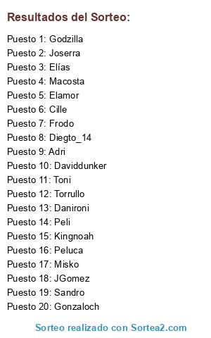 Lista de participantes: Elamor, Cille, Danironi, Daviddunker, Diegto_14, Elías, Frodo, Godzilla, Gonzaloch, JGomez, Joserra, Macosta, Misko, Peli, Peluca, Kingnoah, Torrullo, Sandro, Adri, Toni.