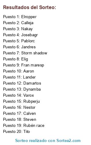 Lista de participantes: Calleja, Aaron, Damartos, Dynamba, Elig, Elropper, Fran maresp, Jandres, Josebagr, Lander, Nakay, Nestor, Pablorc, Rubén race, Rubperju, Calven, Steven, Storm shadow, Tito, Varox.
