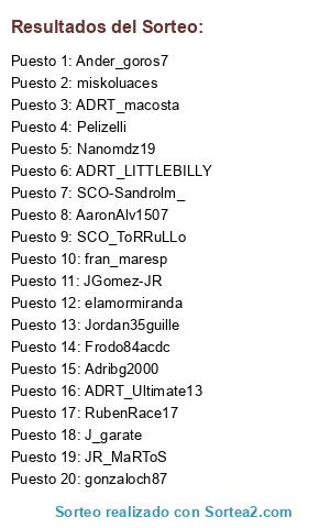 Lista de participantes: AaronAlv1507, Adribg2000, ADRT_LITTLEBILLY, ADRT_Ultimate13, Ander_goros7, elamormiranda, fran_maresp, Frodo84acdc, gonzaloch87, J_garate, JGomez-JR, Jordan35guille, JR_MaRToS, ADRT_macosta, miskoluaces, Nanomdz19, Pelizelli, RubenRace17, SCO_ToRRuLLo, SCO-Sandrolm_.