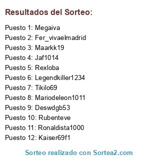 Lista de participantes: Rubenteve, Jaf1014, Tikilo69, Rexloba, Mariodeleon1011, Legendkiller1234, Fer_vivaelmadrid, Deswdgb53, Maarkk19, Megaiva, Ronaldista1000, Kaiser69f1.