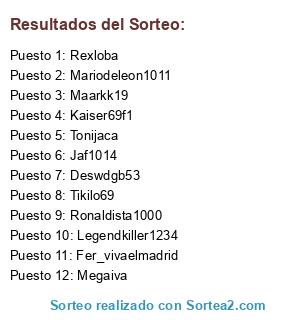 Lista de participantes: Kaiser69f1, Ronaldista1000, Megaiva, Deswdgb53, Mariodeleon1011, Fer_vivaelmadrid, Tonijaca, Legendkiller1234, Maarkk19, Rexloba, Tikilo69, Jaf1014.