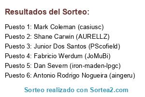 Lista de participantes: Junior Dos Santos (PScofield), Shane Carwin (AURELLZ), Dan Severn (iron-maden-lpgc), Fabricio Werdum (JoMuBi), Mark Coleman (casiusc), Antonio Rodrigo Nogueira (aingeru).