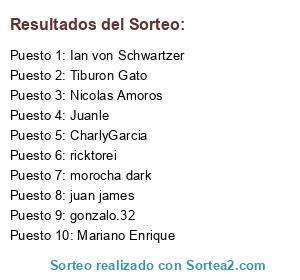 Lista de participantes: maurog086, Juanle, mauchi, Fernando Gonzalez Arrili, Franco.Chaca, brendam, monoborisp, Jezabel Ark, juan pedro gerbelli, gonzalo.32, Zioncity, Eze1311, Kelphes, ursuell, Capitan Gorila, milanocarp, Diogenes Calisto, Sir Algaroth, eltavo1969, julioeze123, Gatienso, llopimza, Estefania Botazzi, moyini90, corazonbostero, Juan Manuel Rodriguez mdq, Tte. Sosa, Ramato, Argentino Guerrillero, Fabian Gregorat, Maty Monte, lukasgomez, DarkAvZ, acaderc, flameu, santyk8, quijanojulian, Tiburon Gato, morocha dark, SirParaghe, Mariano Enrique, CharlyGarcia, Mollison, ricktorei, Demasiadoblues, richie666, Mariano F, Judas Utd, Nicolas Amoros, atila is back, Treiko, Leandro Rojas, francosonatti, megacarnage, Remjjz, medullaguy, cteruel, antim0, generalberto, FernandoGeo, Laura Gallegos, Carajote, Juuliancito, rockandrollnene, Izquierdoz, bruno argento, AleKun, SagasPolis, limpiamadrid, GobCba-AR, juan james, cobas, cronopio.cronopio, martinn14, Juan Cruz, f3de, ElAiel, Matimix, elgordo93, Hernan86, Ykoichi, COLORR, Ian von Schwartzer.