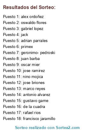 Lista de participantes: adrian parrales, alex ordoñez, antonio alvarez, francisco jaramillo, gabriel lopez, geronimo- pedroski, gustavo game, jack, de la cuadra, jose briones, jose ramirez, juan barba, marco reyes, nino mojica, oscar mier, oswaldo flores, primex, rafael rios.