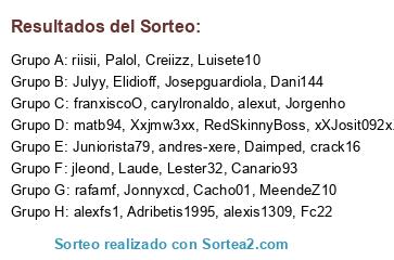 Lista de participantes: Jorgenho, Dani144, xXJosit092xX, Daimped, Elidioff, Creiizz, Jonnyxcd, Adribetis1995, carylronaldo, Xxjmw3xx, riisii, Laude, RedSkinnyBoss, Fc22, Cacho01, Josepguardiola, crack16, MeendeZ10, Lester32, Juniorista79, Canario93, alexut, franxiscoO, alexfs1, Luisete10, jleond, matb94, rafamf, Palol, Julyy, alexis1309, andres-xere.