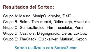 Lista de participantes: ZielCL, Diegoignacio, LuxOoz, dreyko, Quicksilver, Llerar, Mauro, MonipO, Kezon, Alvarilloh, Balon, Matias8, Tom misaki, Semeralloelcd, Didiersagb, TheCrack, Fbn, Persi, trocioloko, Castro-7.