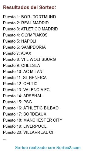 Lista de participantes: ATLETICO MADRID, SAMPDORIA, BORDEAUX, REAL MADRID, VALENCIA FC, ATHLETIC BILBAO, REAL BETIS, CHELSEA, BOR. DORTMUND, NAPOLI, MANCHESTER CITY, OLYMPIAKOS, PSG, UD LAS PALMAS, VILLARREAL CF, VFL WOLFSBURG, LIVERPOOL, SL BENFICA, ARSENAL, AC MILAN, CELTIC, AJAX.