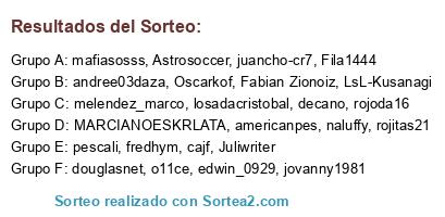 Lista de participantes: fredhym, naluffy, Astrosoccer, jovanny1981, LsL-Kusanagi, rojoda16, Juliwriter, andree03daza, rojitas21, decano, douglasnet, mafiasosss, cajf, melendez_marco, Oscarkof, o11ce, juancho-cr7, Fabian Zionoiz, Fila1444, pescali, americanpes, MARCIANOESKRLATA, edwin_0929, losadacristobal.