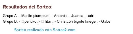 Lista de participantes: - adri, - pericko, - Titán, - Martín piumpium, - Chris,con bigote krieger, - Gabe, - Juanca, - Antonio.