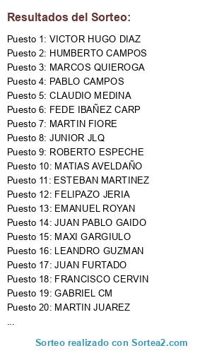 Lista de participantes: HUMBERTO CAMPOS, JUAN FURTADO, JUAN PABLO GAIDO, JUNIOR JLQ, LEANDRO GUZMAN, MARCOS QUIEROGA, MARTIN FIORE, MARTIN JUAREZ, MATIAS AVELDAÑO, MAXI GARGIULO, NAHUEL AVENDAÑO, PABLO CAMPOS, ROBERTO ESPECHE, TOMAS MARTINEZ, VICTOR HUGO DIAZ, CLAUDIO MEDINA, CRISTIANO E VANESA ALMADA, DAVID DIAZ, EMANUEL ROYAN, ESTEBAN MARTINEZ, FEDE IBAÑEZ CARP, FELIPAZO JERIA, FRANCISCO CERVIN, GABRIEL CM.
