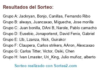 Lista de participantes: 1-Alemania, 2-Argentina, 3-Belgica, 4-Brasil, 5-Camerun, 6-Croacia, 7-Dinamarca, 8-Turquia, 9-Urugay, 10-España, 11-Estados Unidos, 12-Francia, 13-Holanda, 14-Inglaterra, 15-Italia, 16-Portugal, 17-Suecia.