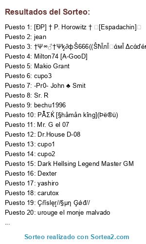 Lista de participantes: Dexter, Sr. R, Makio Grant, Dr.House D-08, Mr. G el 07, DarkEvilOrl, РẪΣЌ [§håmån kîng](Þë®ü), bechu1996, -Pr0- John ♣ Smit, [ĐP] † P. Horowitz † ᾧ[Espadachin]ᾧ, Genji_66 [C-gm] (I), Dark Hellsing Legend Master GM, †Ψ∞♂†Ψķ∂фŜ666((ŜħĪлĪⓖάмĪ ΔcάďéмĪco)), SHAKA DE VIRGO JDS, Milton74 [A-GooD], ۞LoRd PhOeNix۞, Çŕĭslęŗ//§μη Ģǿđ//, carutox, yashiro, jean, urouge el monje malvado, cupo1, cupo2, cupo3.