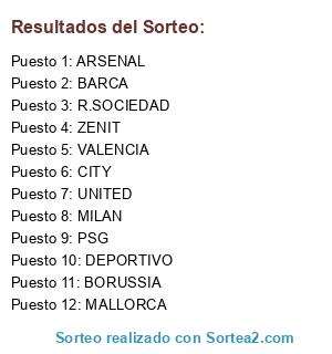 Lista de participantes: R. ZARAGOZA (xX_BaLa_XoN_Xx), R. MADRID (DrFronkonstin), TOTTENHAM (AyozePodolski), FC BARCELONA (jorgeoptico), LIVERPOOL FC (pacopaquet), ALMERIA (osorolo2310), PSG (alfitantalo), REAL SOCIEDAD (Pedro2408).