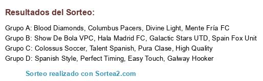 Lista de participantes: Galway Hooker, Perfect Timing, Divine Light, Galactic Stars UTD, Show De Bola VPC, Talent Spanish, Hala Madrid FC, High Quality, Spain Fox Unit, Columbus Pacers, Mente Fría FC, Colossus Soccer, Pura Clase, Easy Touch, Blood Diamonds, Spanish Style.