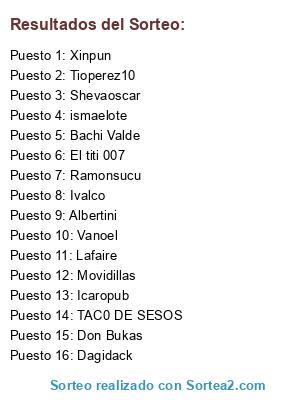 Lista de participantes: Bachi Valde, Icaropub, Xinpun, Albertini, Vanoel, Tioperez10, Don Bukas, Ramonsucu, Shevaoscar, Lafaire, Ivalco, El titi 007, Dagidack, Movidillas, TAC0 DE SESOS, ismaelote.