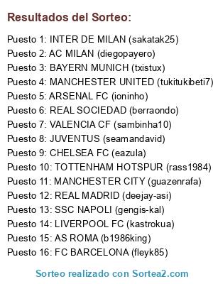 Lista de participantes: FC BARCELONA (fleyk85), BAYERN MUNICH (txistux), REAL SOCIEDAD (berraondo), JUVENTUS (seamandavid), CHELSEA FC (eazula), TOTTENHAM HOTSPUR (rass1984), REAL MADRID (deejay-asi), INTER DE MILAN (sakatak25), AS ROMA (b1986king), VALENCIA CF (sambinha10), MANCHESTER UNITED (tukitukibeti7), ARSENAL FC (ioninho), SSC NAPOLI (gengis-kal), LIVERPOOL FC (kastrokua), MANCHESTER CITY (guazenrafa), AC MILAN (diegopayero).