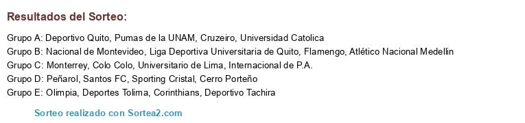 Lista de participantes: Atlético Nacional Medellin, Cerro Porteño, Colo Colo, Corinthians, Cruzeiro, Deportes Tolima, Deportivo Quito, Deportivo Tachira, Flamengo, Internacional de P.A., Liga Deportiva Universitaria de Quito, Monterrey, Nacional de Montevideo, Olimpia, Peñarol, Pumas de la UNAM, Santos FC, Sporting Cristal, Universidad Catolica, Universitario de Lima.