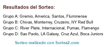 Lista de participantes: Internacional, Gremio, Santos, Cruzeiro, Sao Paolo, Fluminense, Flamengo, NY Red Bull, LA Galaxy, Chivas, Pumas, America, Cruz Azul, Monterrey, Boca Juniors, River Plate.