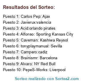 Lista de participantes: Alfonso: Sporting Kansas City, Alvaro: NY Red Bull, Carlos Pep: Ajax, Acid:orlando pirates, Caveman: Kashiwa Reysol, tonyplaymanual: Sevilla, Campero:cadiz, Brainismr: Barcelona, Javierux:valencia, PepeS-Works: Liverpool.