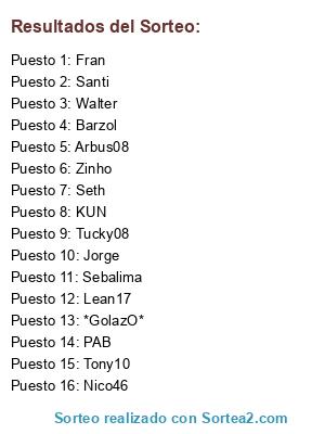 Lista de participantes: Fran, Barzol, Seth, Zinho, Walter, Tucky08, Santi, Jorge, KUN, Sebalima, Lean17, Nico46, PAB, *GolazO*, Tony10, Arbus08.