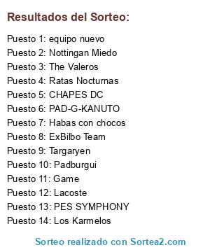 Lista de participantes: PES SYMPHONY, Habas con chocos, CHAPES DC, ExBilbo Team, Game, Los Karmelos, PAD-G-KANUTO, Padburgui, Targaryen, Nottingan Miedo, The Valeros, Ratas Nocturnas, Lacoste, equipo nuevo.
