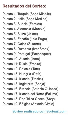 Lista de participantes: Irlanda (Troska), Italia (Borja Medina), Irlanda del Norte (Falumo), Hungría (Rafa), Gales (Zurante), España (Lolo Puga), Alemania (Montxo), Turquia (Borja Mihalic), Inglaterra (Benja), Portugal (Pacopaquet), Rusia (Fronko), República Checa (Sory), Polonia (Tate), Austria (Isma), Suecia (Faroles), Bélgica (Antonio Circle), Suiza (Jaime), Rumanía (IvanBronx), Francia (Antonio Guisado).
