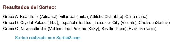 Lista de participantes: Athletic Club (bhb), Villarreal (Tirita), Sevilla (Pepe), Leicester City (Vicente), Chelsea (Serluis), Everton (Naco), Newcastle Utd (Valdes), Crystal Palace (Tibu), Real Betis (Adrianct), Las Palmas (Ko3y), Celta (Tana), Español (Bertitus).