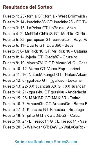 Lista de participantes: 1- Jojeda GT: Ojeda87 - Cruzeiro, 2- MoRTaLChRiiiiS GT: MoRTaLChRiiiiS - Atlético Mineiro, 3- xGorKaZz GT: xGorKaZz - Palmeiras, 4- Kinectox GT: Kinectox - Botafogo, 5- Wallygar GT: DeViL xWaLyGaRx - Granada, 6- Mr Rick 10 GT: Mr Rick 10 - Catania, 7- Arnaust3n GT: Arnaust3n - Barça B, 8- jjgalloso GT : jjgalloso - Levante, 9- julito GT:FsK x aDiDaS - Celtic, 10- cheto5999_2 GT: ronaldo59992 - Swansea, 11- Duarte GT: Dua 360 - Betis, 12- Varox GT: Varox Esp - Lorient, 13- Havi1987 GT: Havi Stae - L.A. Galaxy, 14- Isacinho86 GT: Isacinho25 - FC Twente, 15- LoPeina GT: LoPeina - Anzhi, 16- NataelArkangel GT : NataelArkangel - Mallorca, 17- pistolikas GT: pistolikas - America de Mexico, 18- SeRgioOo xX GT: SeRgioOo xX - Espanyol, 19- Alvaro7VLC GT: Alvaro VLC - Cessena, 20- Ignigo GT: Ignigo - Standard de Lieja, 21- xpaskku GT :paskku - Anderlecht, 22- XX Juancafr XX GT: XX Juancafr XX - NY Red Bulls, 23- perropicor GT: perropicor - Rayo Vallecano, 24- ElFresco14 GT: ElFresco14 - Vasco Da Gama, 25- torrija GT: torrija - West Bromwich Albion, 26- xou69 GT: xou77 - Sochaux, 27- josemolon95 GT: josemolon95 - Real Sociedad, 28- MAKI3R GT: MAKI3R - Torino.